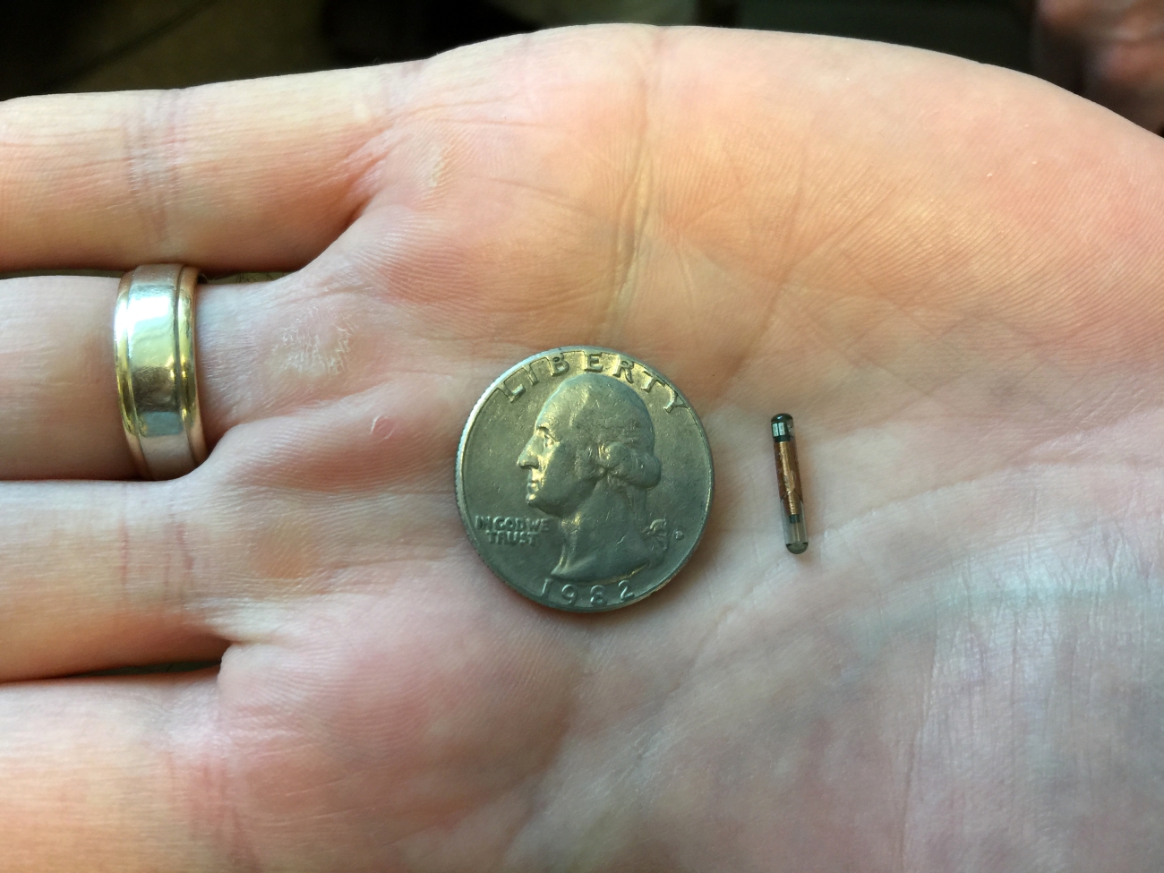The size of a passive integrated transponder (PIT) is shown compared to a quarter.