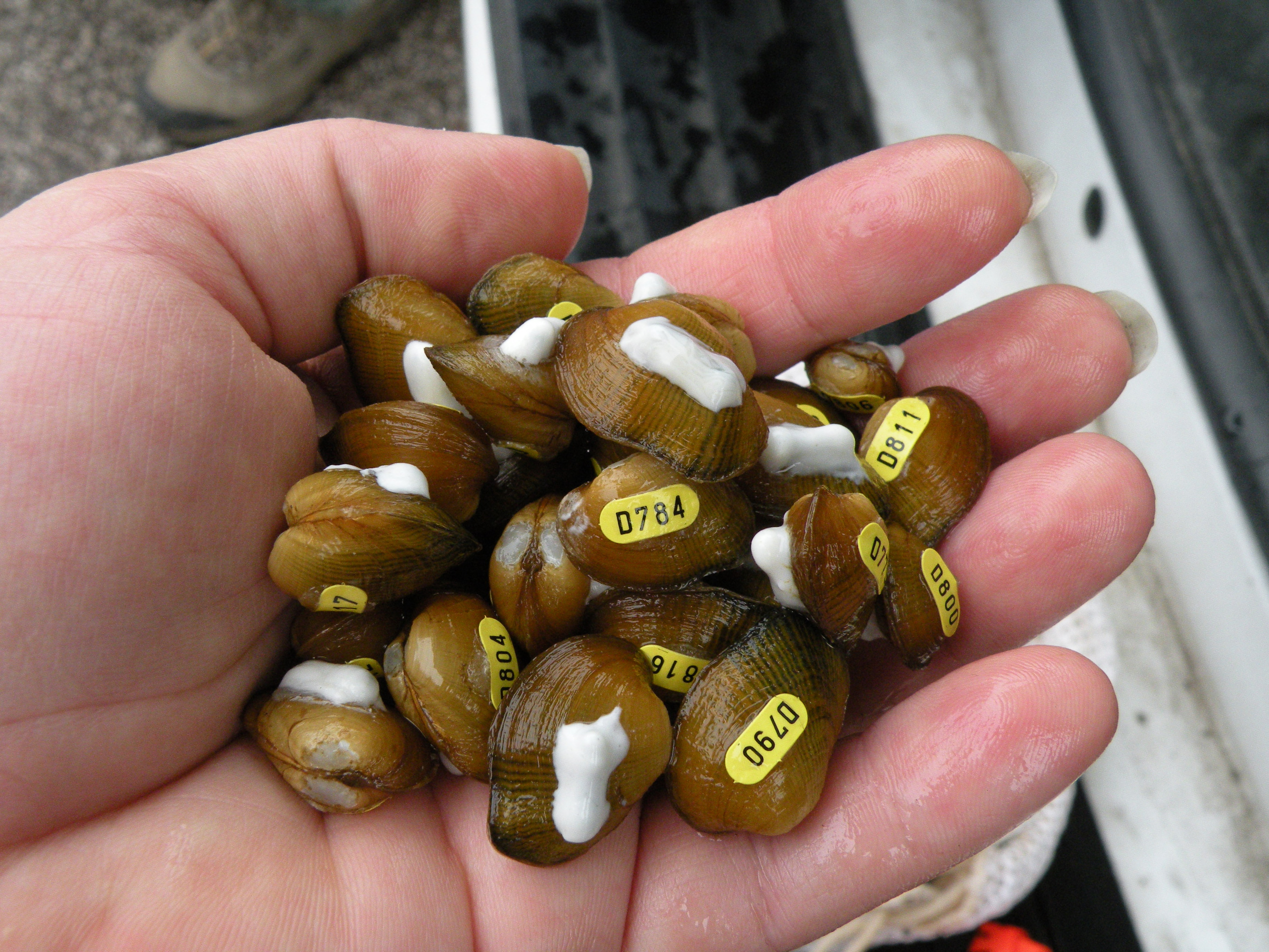 PIT tags coated in white epoxy in combination with Hallprint tags can be used to monitor imperiled species like the northern riffleshell (Epioblasma torulosa rangiana). Photo: Rachel Mair, USFWS.