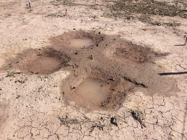 A plot at Petrified Forest National Monument that was pitted and seeded after a rain showing the increased moisture these treatments collected.