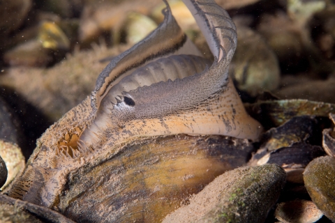 Plain pocketbook mussel displaying lure, fish mimic with eye spot