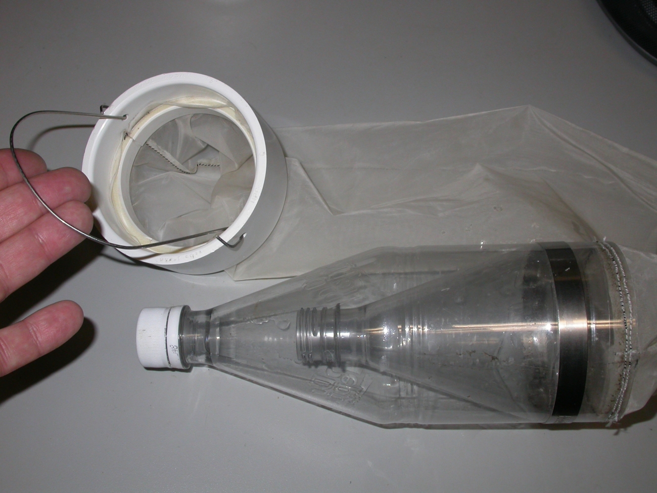 A modified plankton net used at Missouri State University to collect juveniles from the RPS. To plastic bottles are nested on the end of the net to create a dead space and protect the newly metamorphosed juveniles from the turbulence of the net. Photo: Chris Barnhart, Missouri State University.