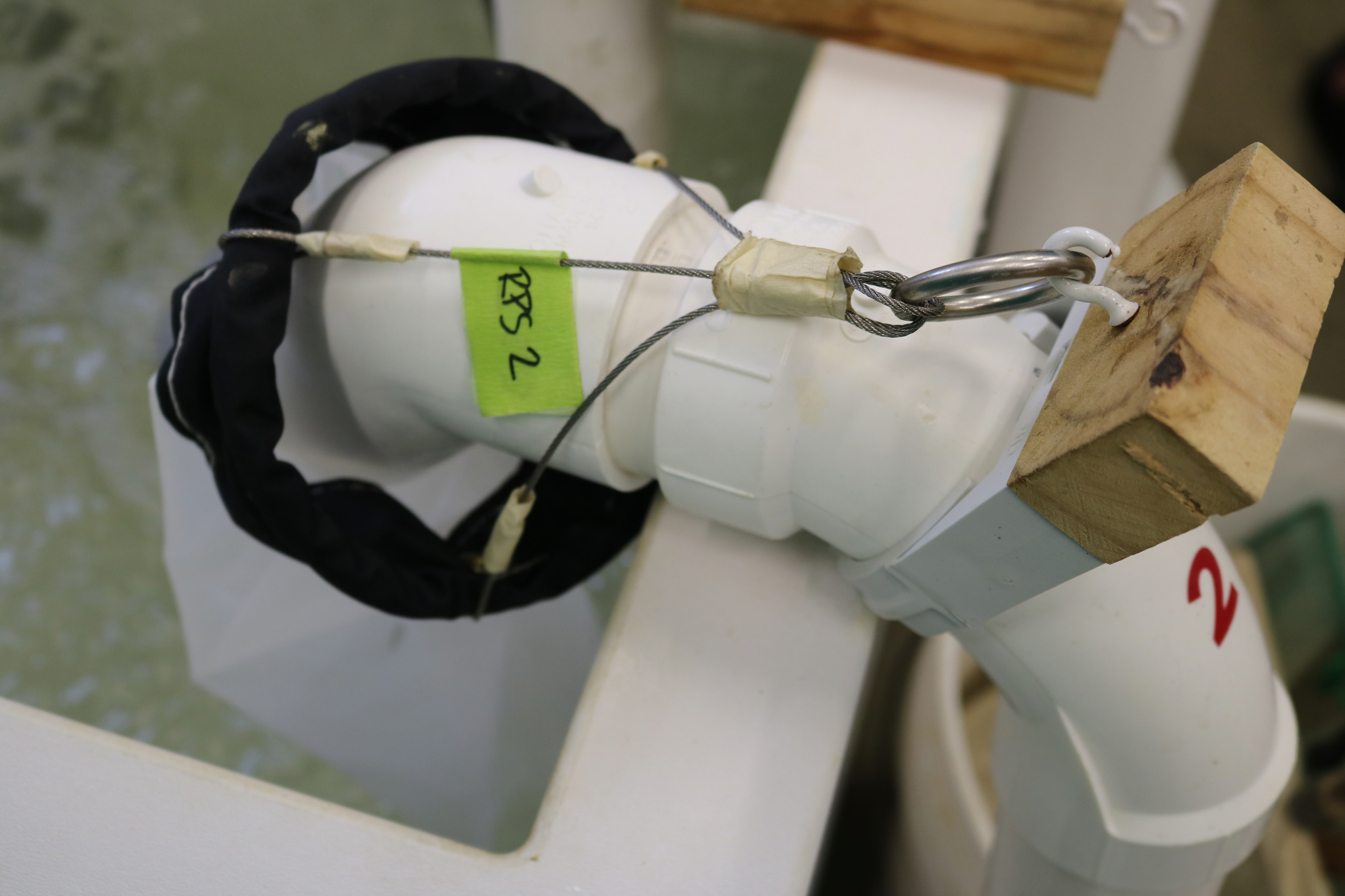 A plankton net hanging over the RPS tank outflow pipe to collect juvenile mussels at the Virginia Fisheries and Aquatic Wildlife Center at Harrison Lake National Fish Hatchery. Photo: Matthew Patterson, USFWS.