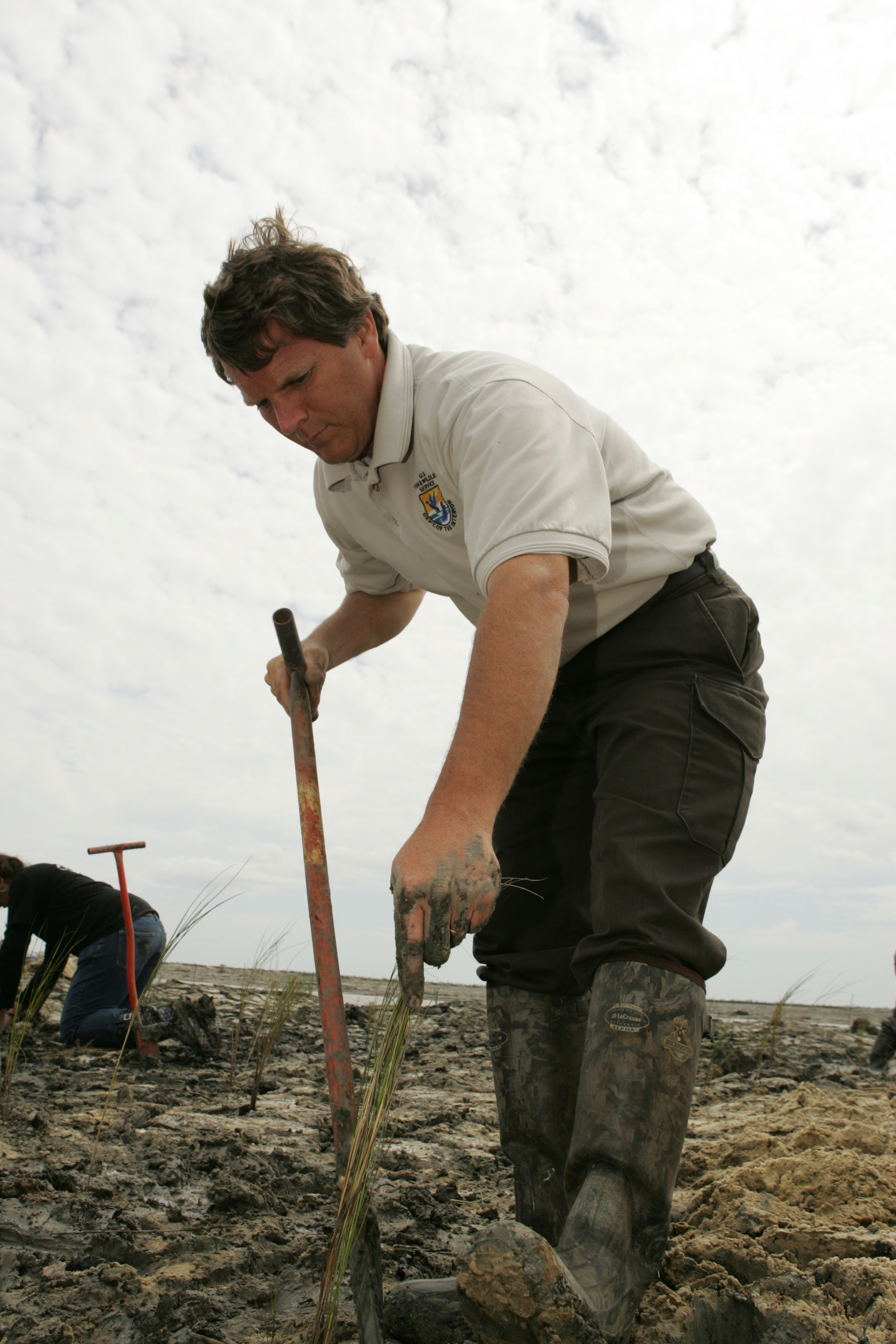 A Big Branch Marsh National Wildlife Refuge employee plants grass to help build up the marshland.