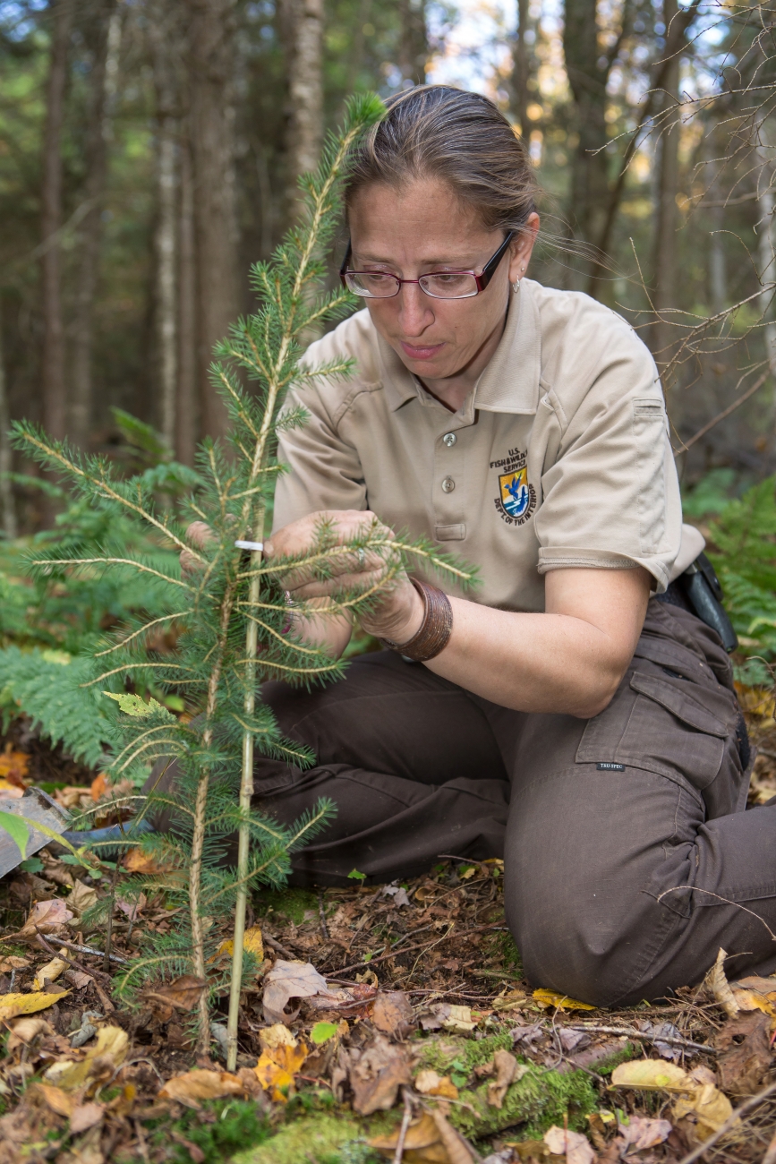 Biologist plants Red Spruce trees at the refuge.