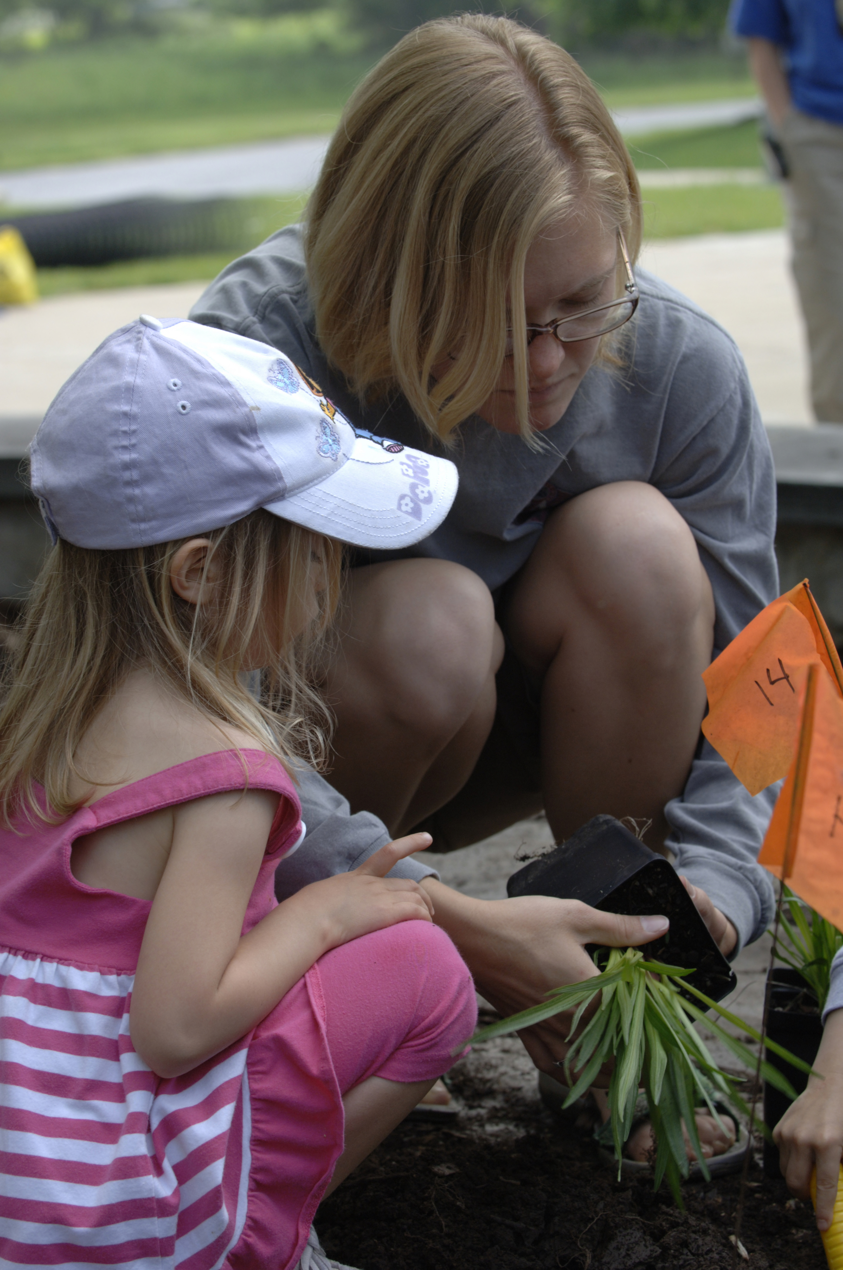 An educator shows a young girl how to take a plant out of its pot without losing the roots.
