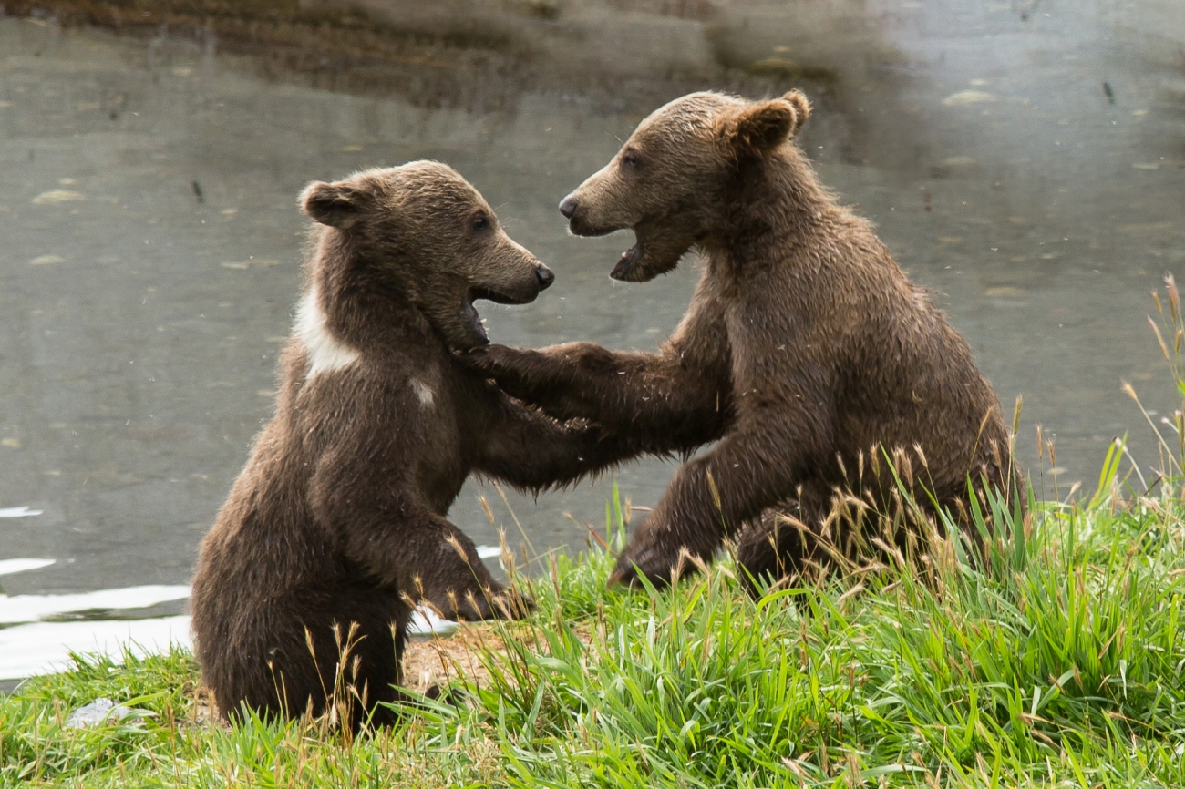 Playful wrestling between two Kodiak brown bear subadults. Kodiak brown bears are a distinct subspecies from mainland brown bears; they have been isolated on the archipelago since the last ice age, about 12,000 years ago. A rich variety of vegetation, salmon, and berries provide ideal habitat for bears, and their population flourishes - estimated at about 3,000 bears within the boundaries of the Kodiak Refuge.