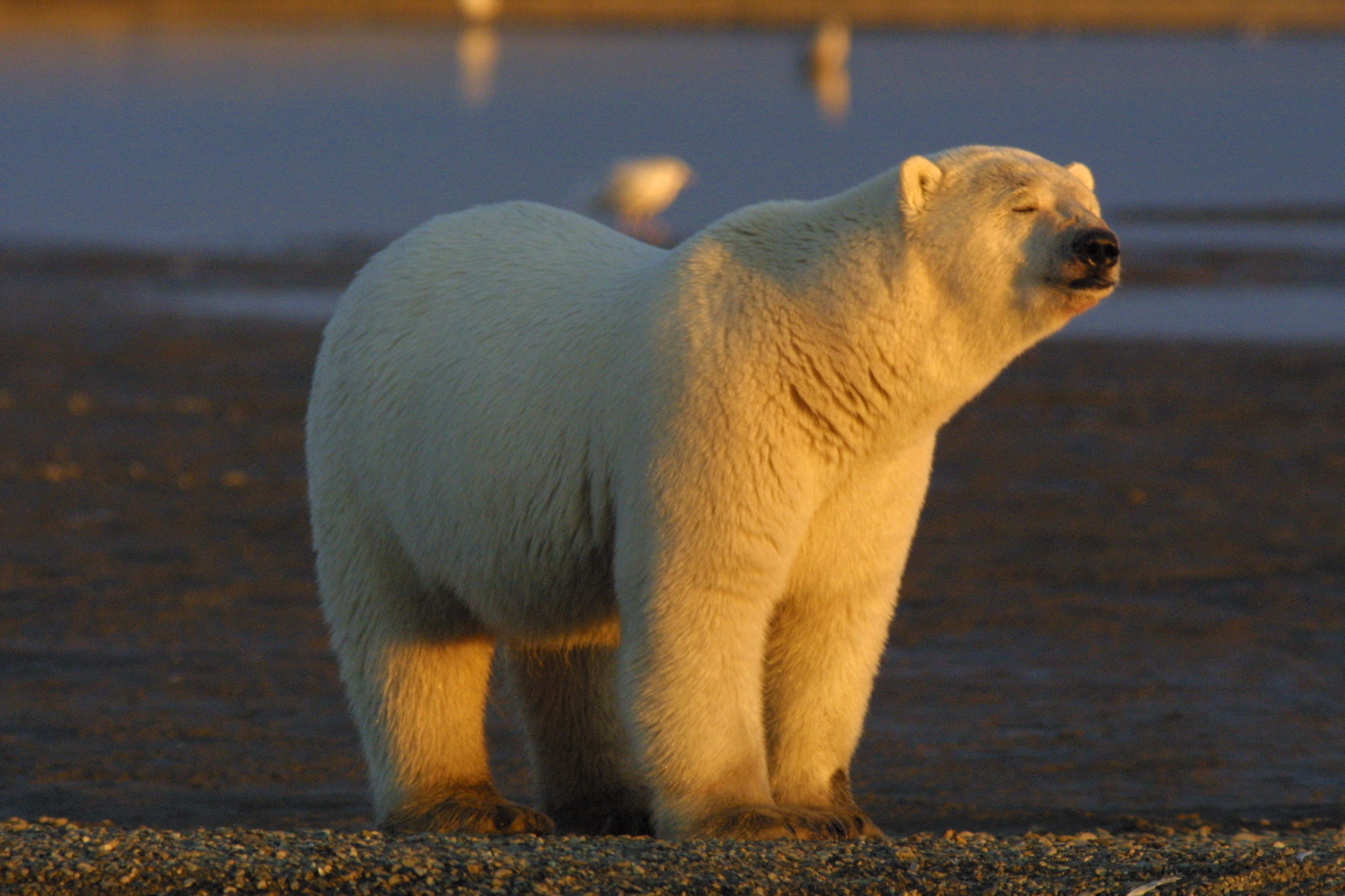 Polar bear on beach at sunset