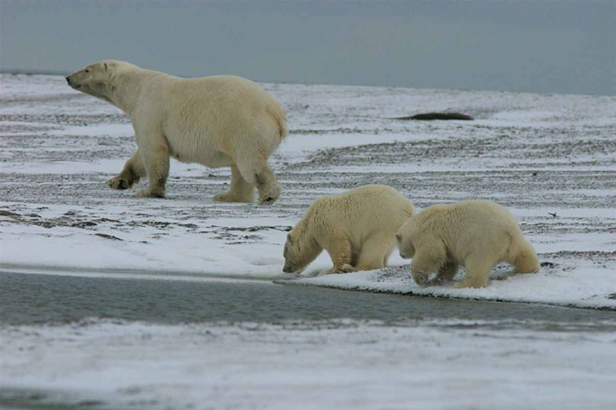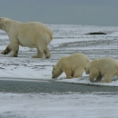 A polar bear mother and two cubs of the year sniffing the air and the ground.