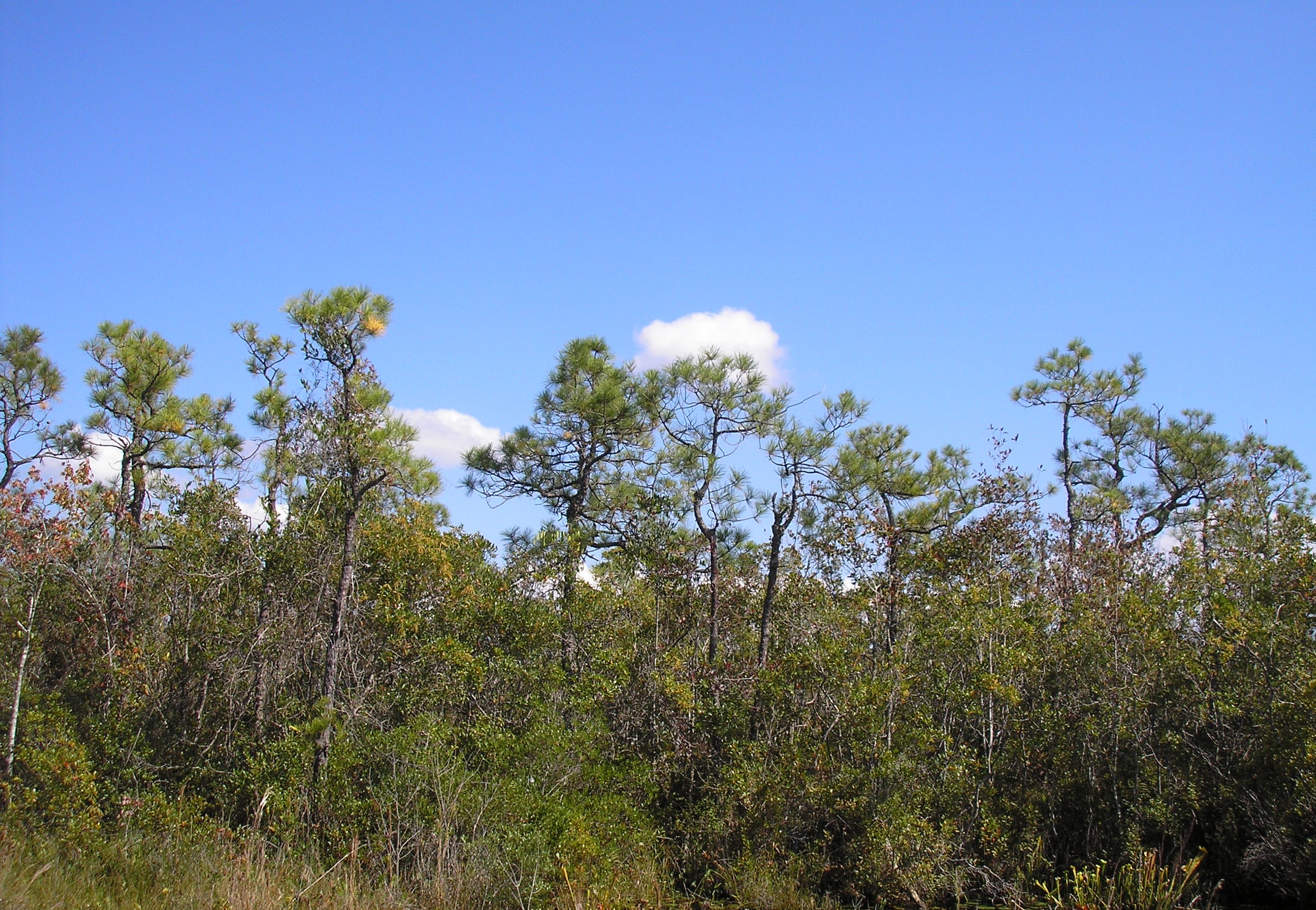 Pond pine pocosin, shown here at Pocosin Lakes National Wildlife Refuge in North Carolina, is characterized by deep peat soils, resulting in a sparse canopy of stunted pines and a dense shrub layer.