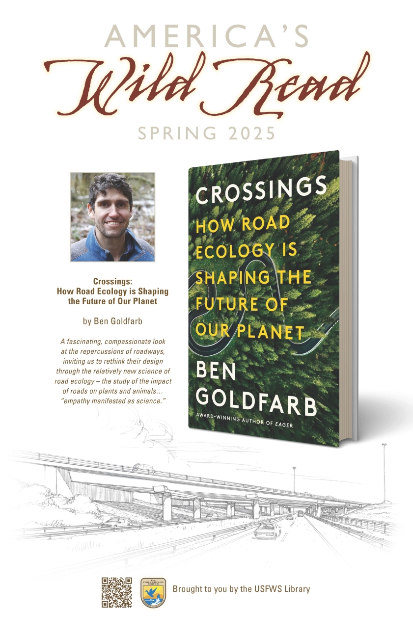 Poster for America’s Wild Read Spring 2025 with head and shoulders image of author and image of book cover for Crossings. Graphics: Richard DeVries/USFW