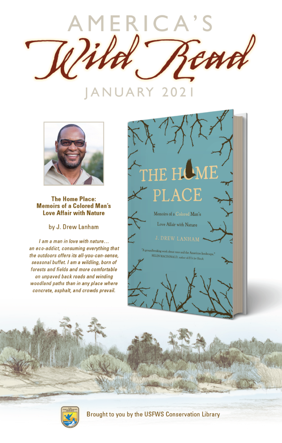 Poster for America’s Wild Read Winter 2021 with head and shoulders image of author and image of book cover for The Home Place. Graphics: Richard DeVries/USFWS