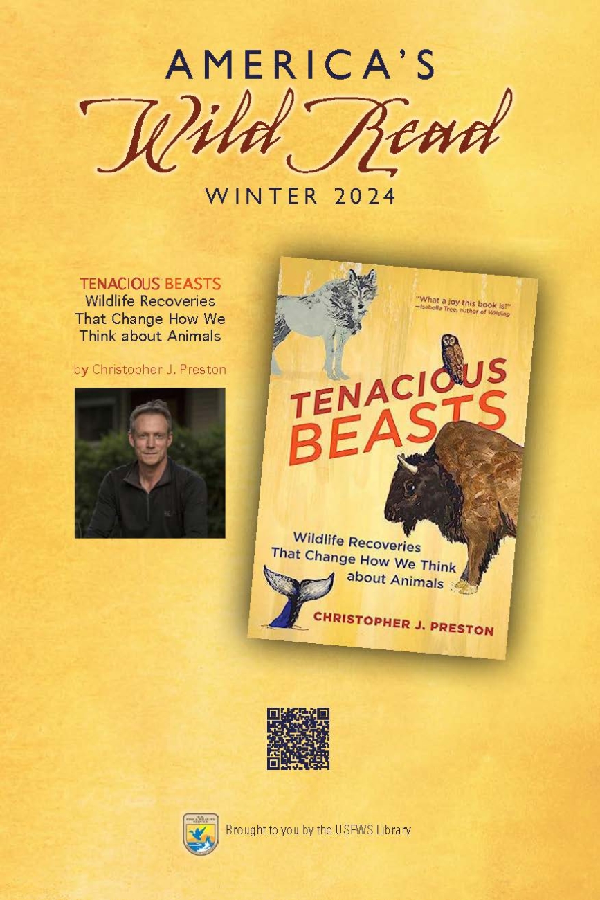 Poster for Winter 2024's Wild Read, Tenacious Beasts by Christopher J. Preston. Graphics: John Embrey/USFWS.