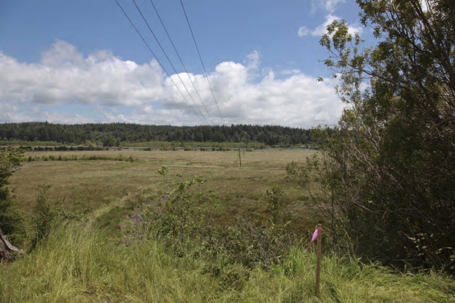 View of the existing overhead electrical transmission line through Bandon Marsh National Wildlife Refuge. The transmission line will be relocated underground using trench and boring techniques from this bluff on the north side of the Coquille River Floodplain to the forested hill in the background on the south side of the river. Image taken from USFWS Pacific Region Flickr page.