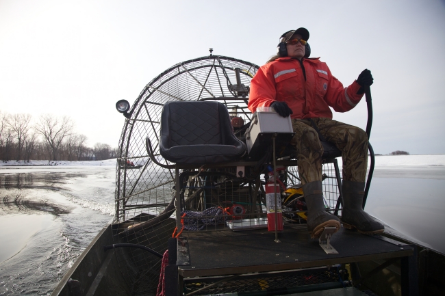 Service employee, Wendy Woyczik, practicing water to ice transitions. Winter airboat.