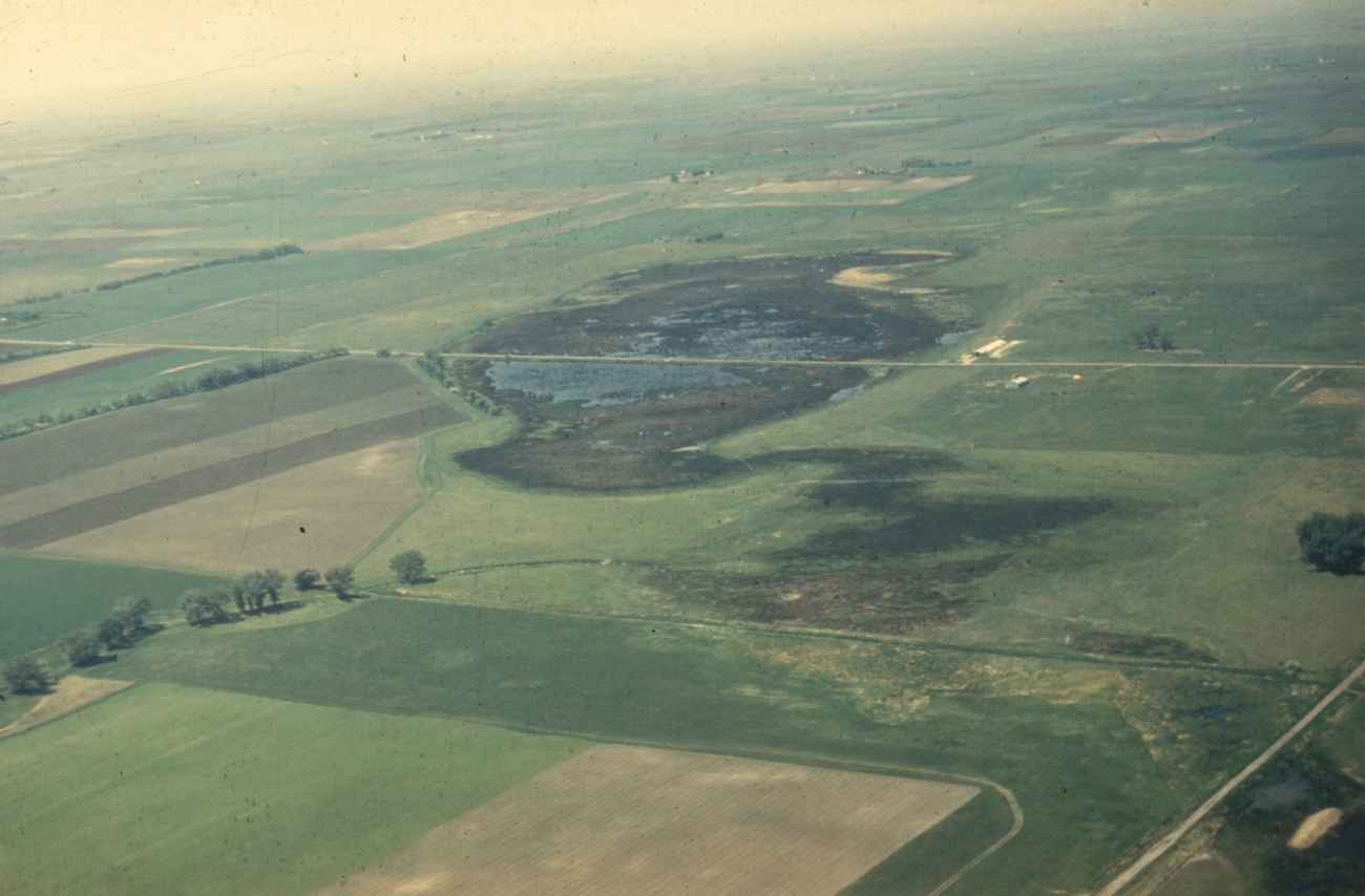 An aerial photo of a prairie pothole with a road through the center in South Dakota.
