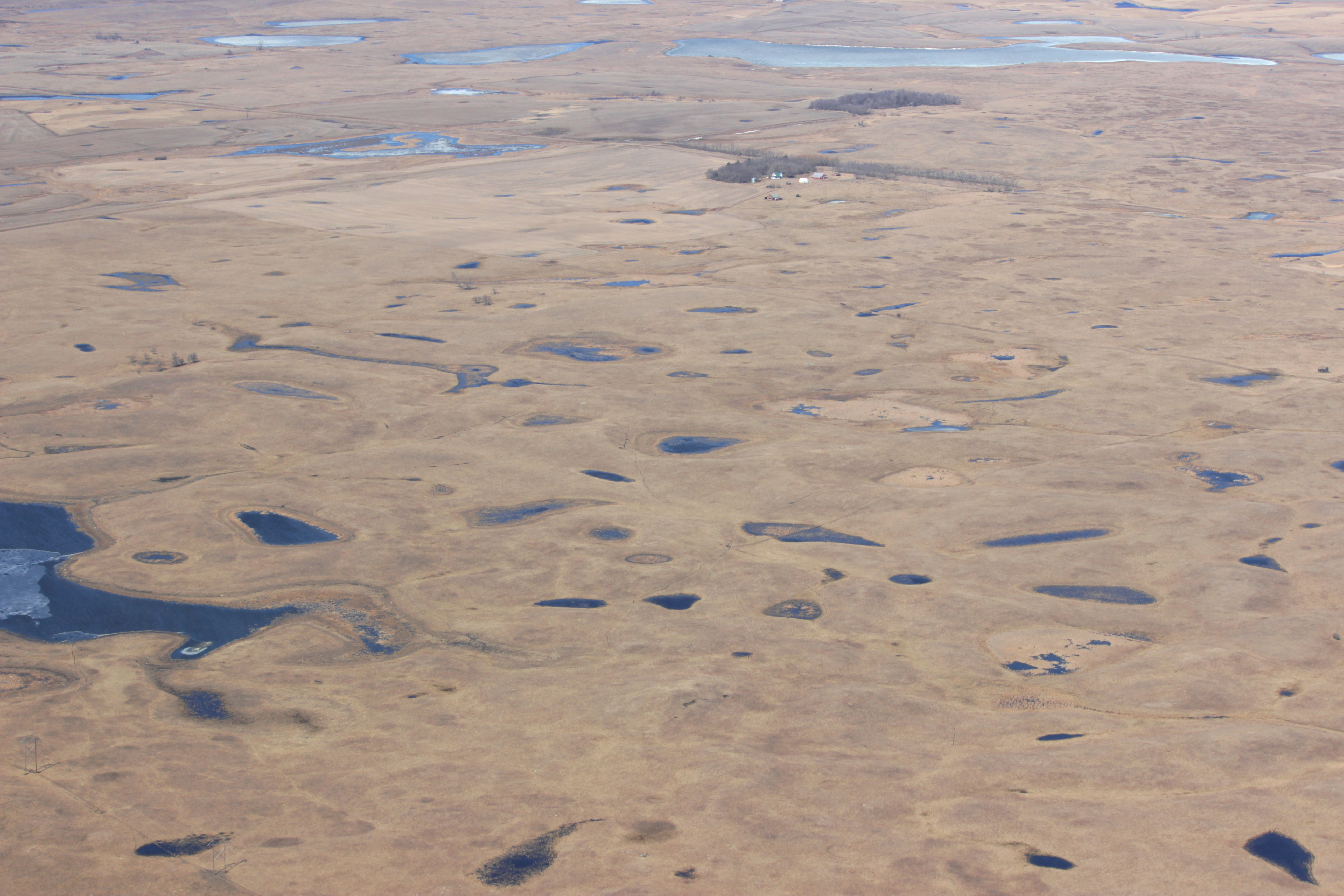 A prime example of what prairie pothole wetlands look like from the air. This is taken in the Spring before the new grass has greened up, so most of the surrounding prairie is still brown from the Winter. After a few warmer days and some good rainfall, this scene will be lush with new growth.