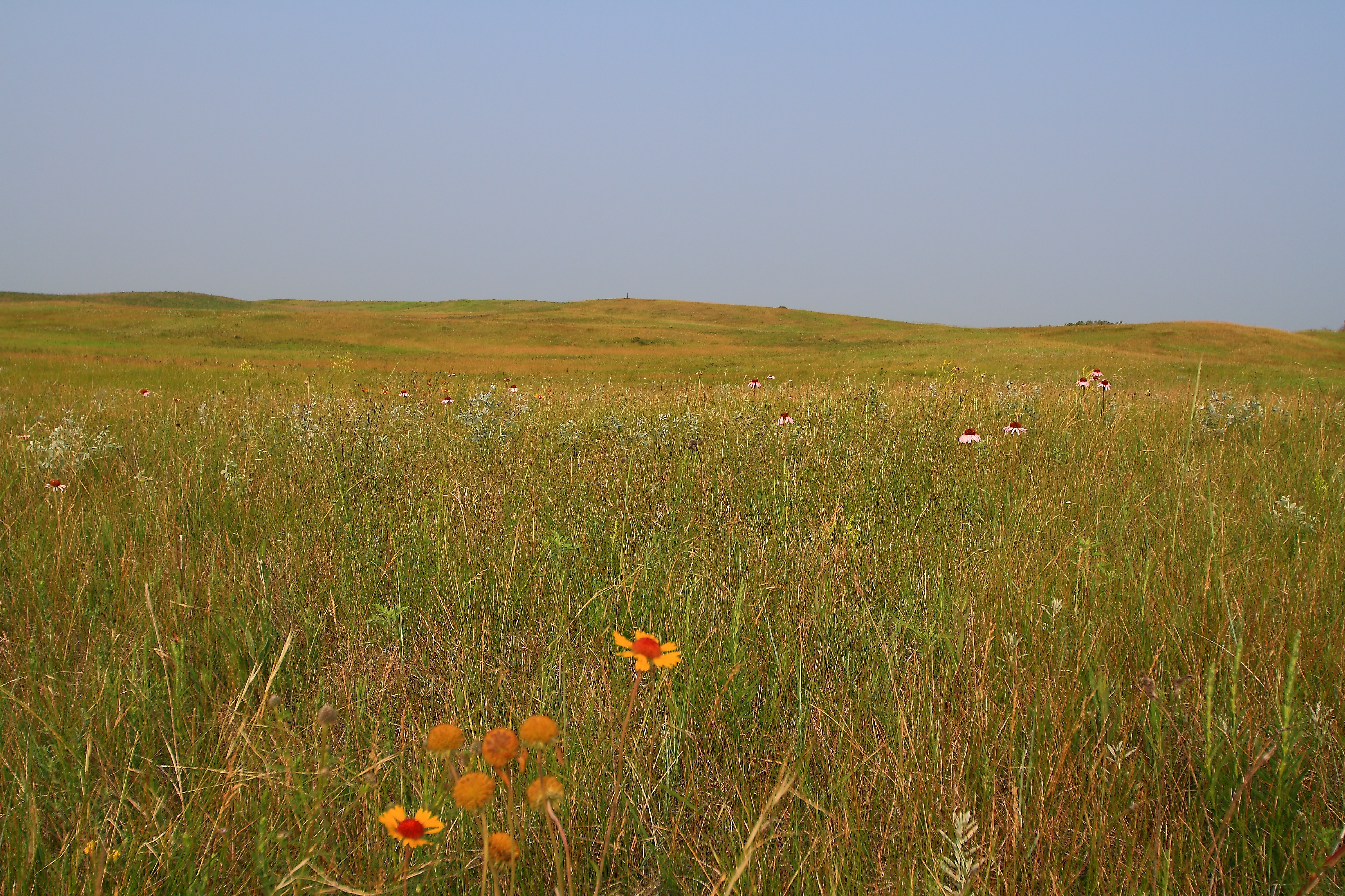 Rolling prairie North Dakota landscape scattered with wildflowers.