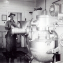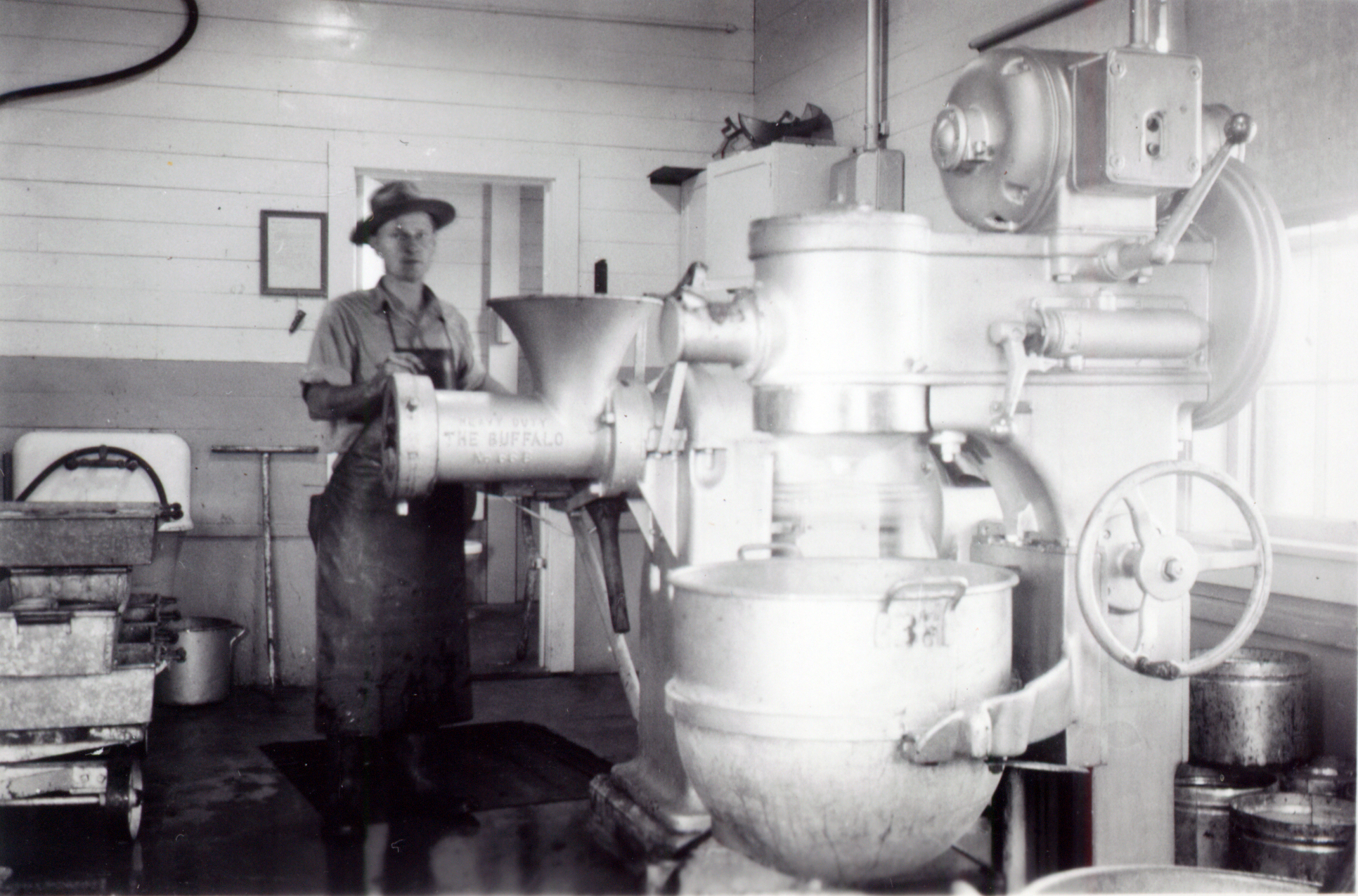 Herb Schwerin stands beside an enormous meat grinder at Coleman National Fish Hatchery.
