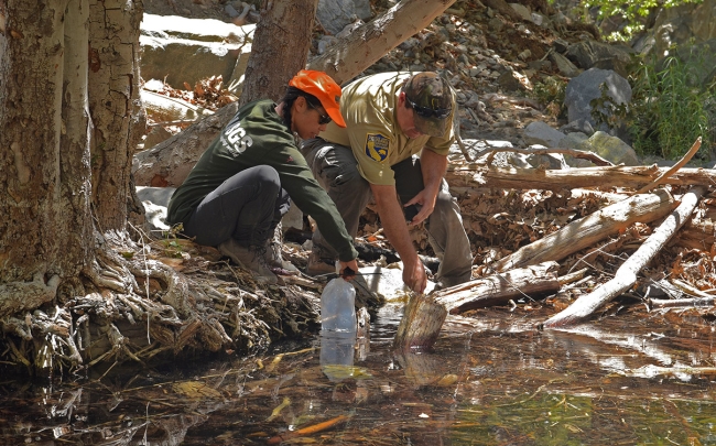Monique Wong, USGS biological science technician and Tim Hovey, senior environmental scientist for California Department of Fish and Wildlife place tadpoles into the water for acclimation prior to release.