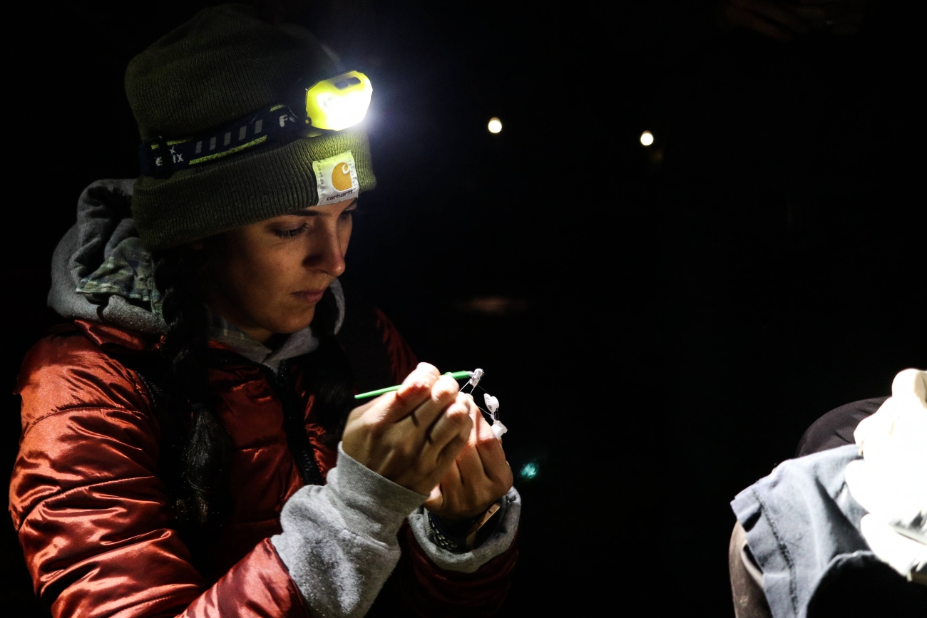 Kristi Confortin, N.C. Wildlife Resources Commission, preparing a transmitter to be placed on a gray bat to track its movement in Western North Carolina.