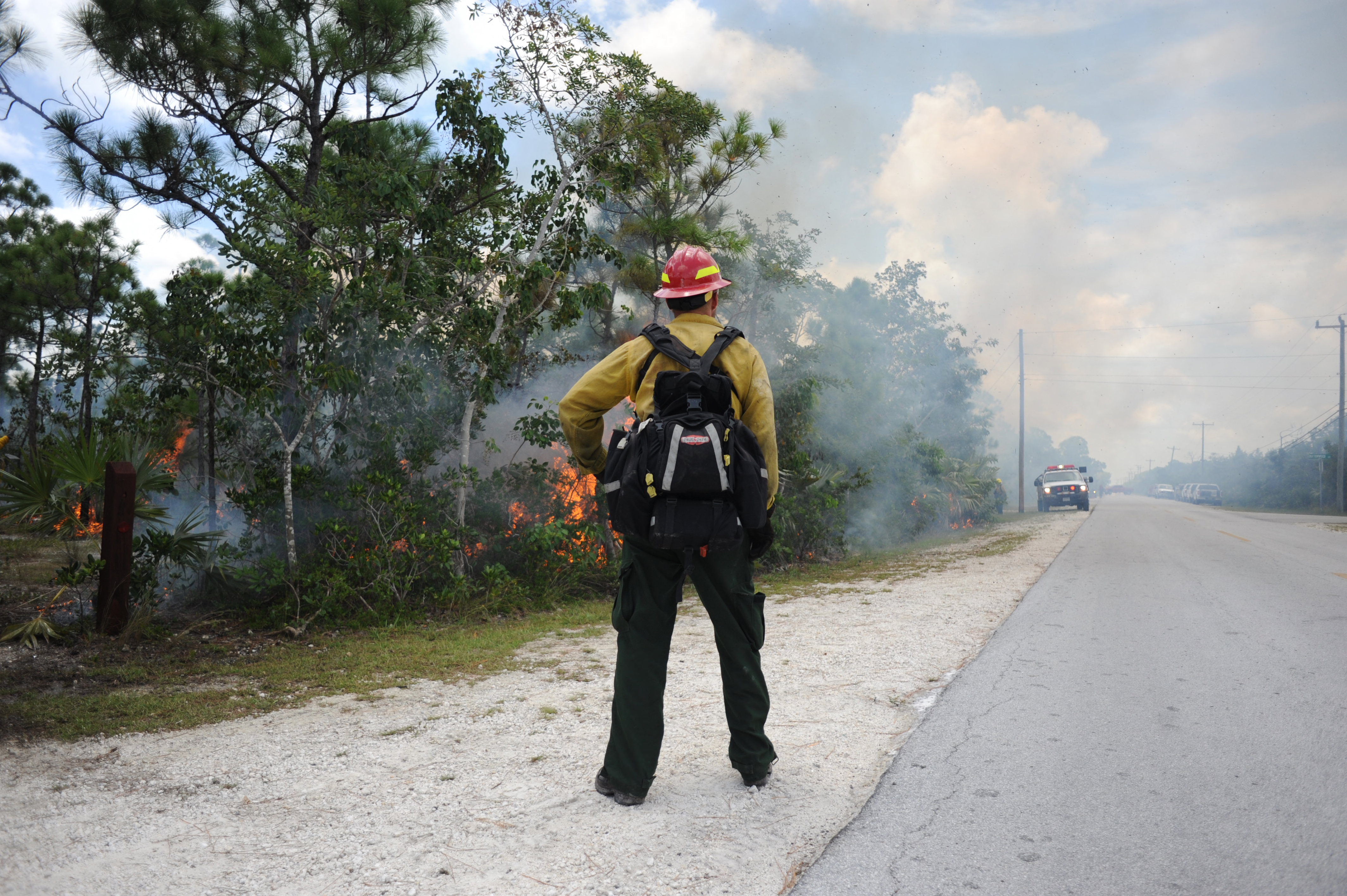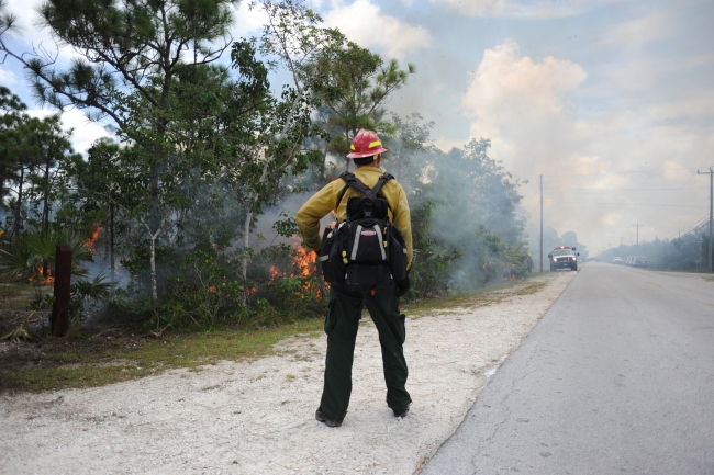 A firefighter watches a prescribed fire at National Key Deer Refuge.