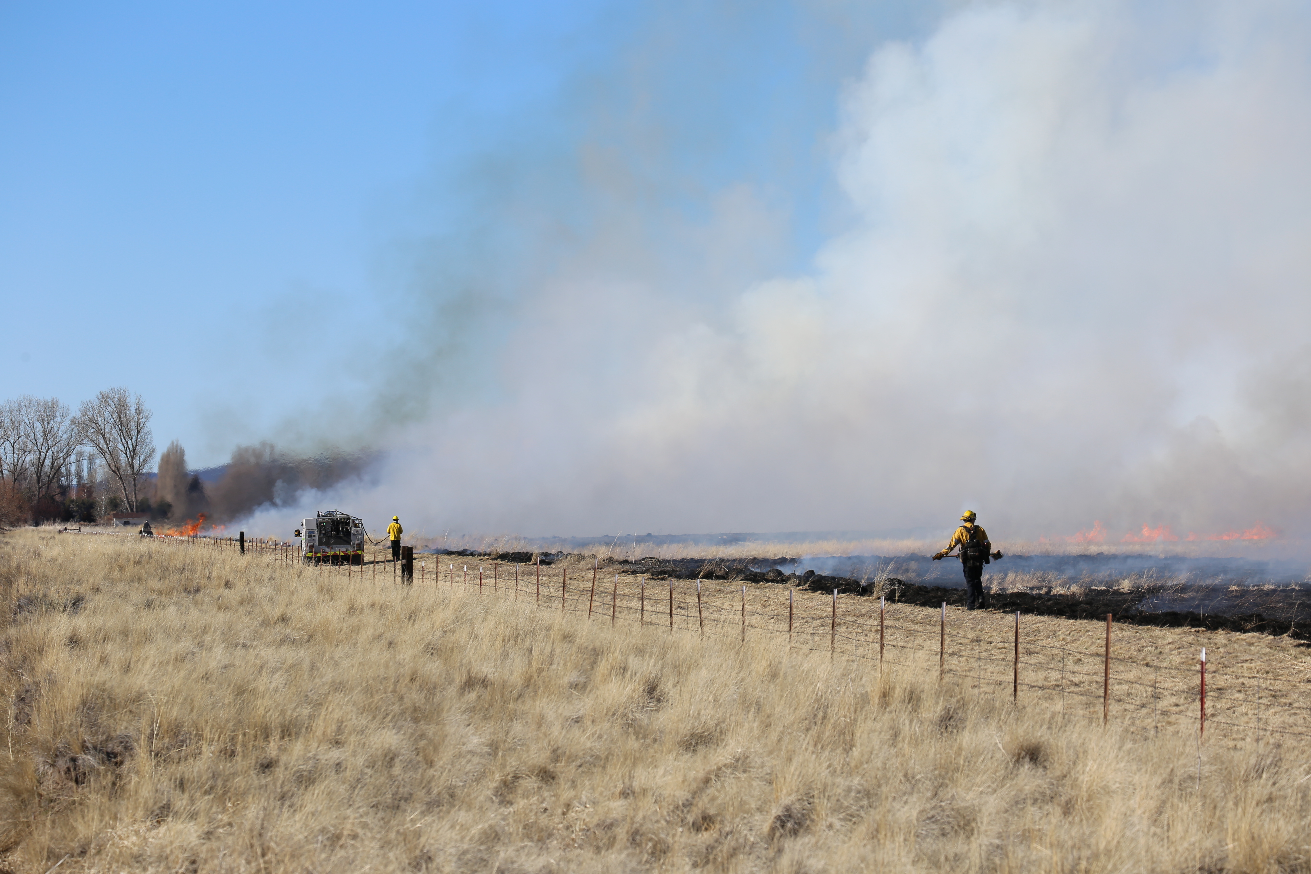 USFWS firefighters worked with our partner firefighters from Modoc National Forest and CAL FIRE to successfully implement a 300-acre prescribed fire on the Modoc National Wildlife Refuge on 1/27/2022. The prescribed fire objective was to reduce the fuel load in the marsh; therefore, reducing the threat during wildfire season. A secondary objective is to reduce the thatch in the marsh from previous year marsh grass growth. Migratory birds will be able to find food and water easier with less thatch. Photo of open field featuring two firefighters and smoke from prescribed burn by USFWS.