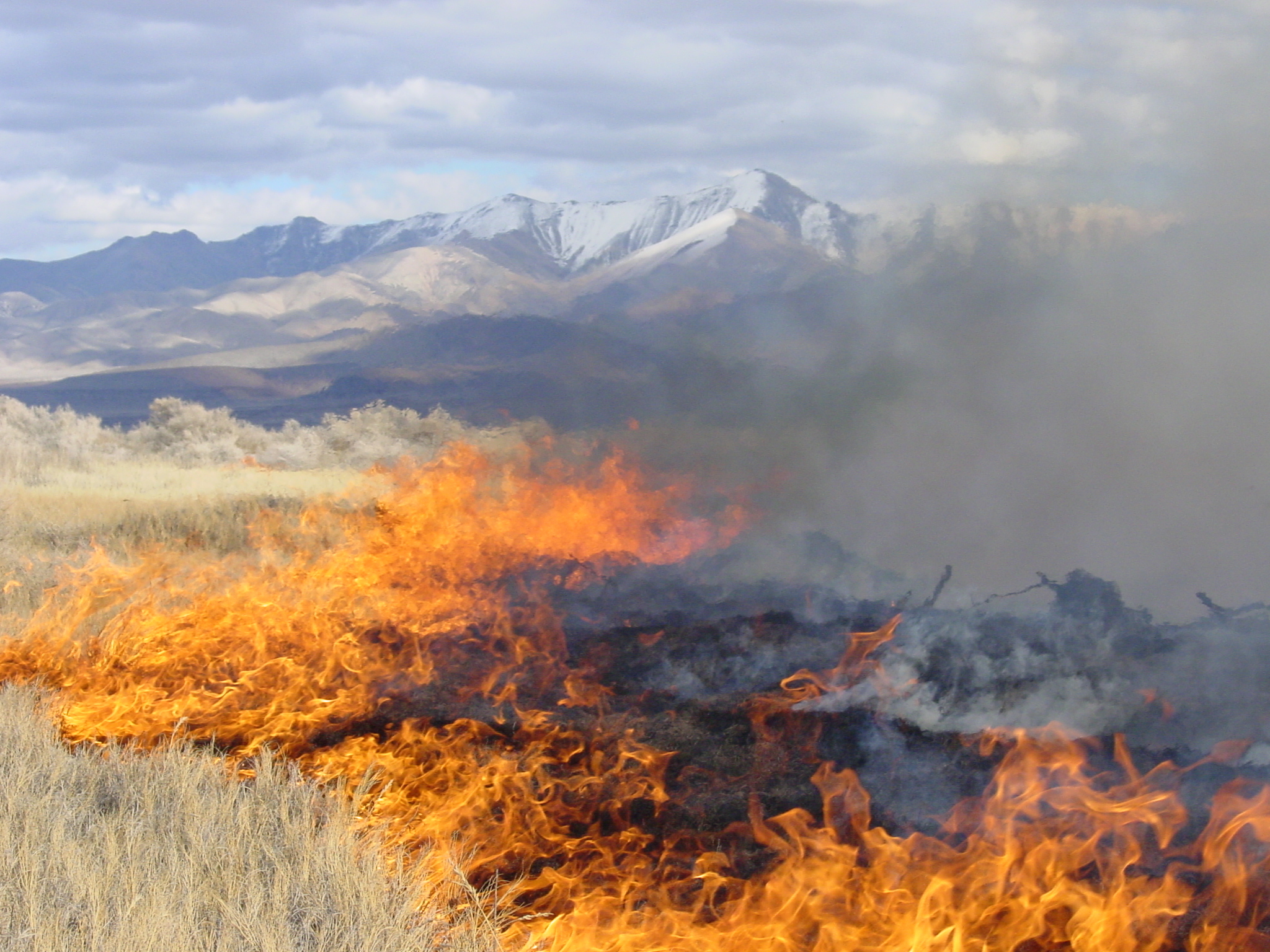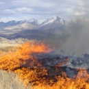 Prescribed fire burns with snow capped peaks in background at Stillwater NWR