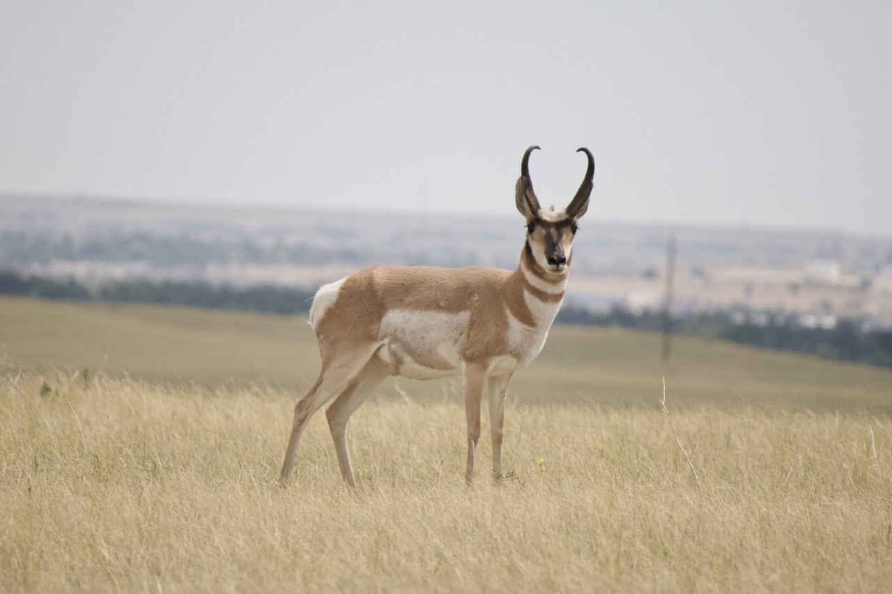 A pronghorn buck stands on a grassy hillside at F.E. Warren Air Force Base.