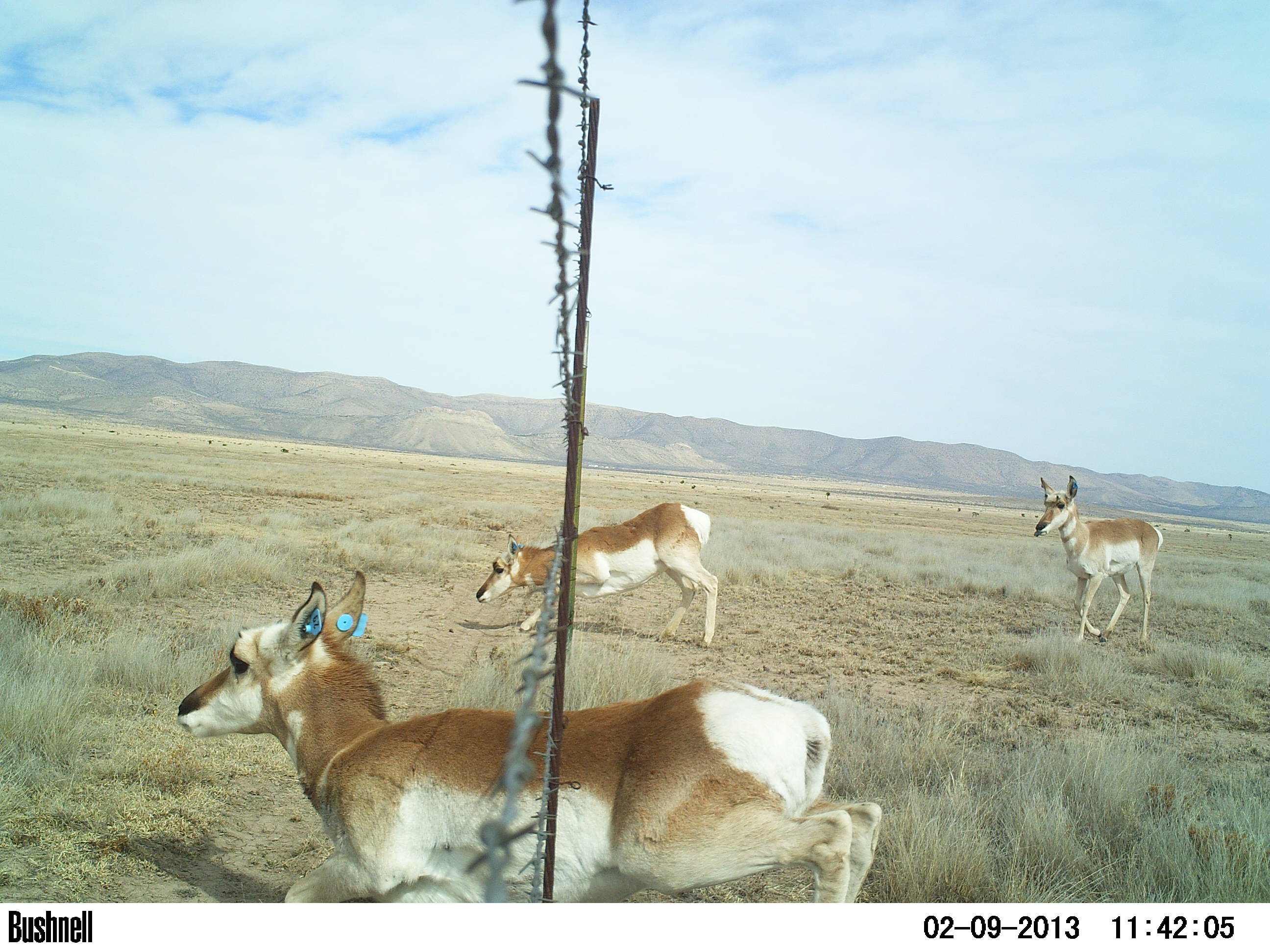 Translocated and resident pronghorn pass underneath modified barb-wire fencing.