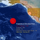 Map displaying the United States, the size and color of dots geographically represent the percentage of ESA-listed plant species that Machida prepared for a Service presentation celebrating the ESA 50th Anniversary.