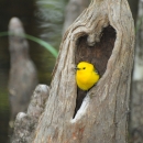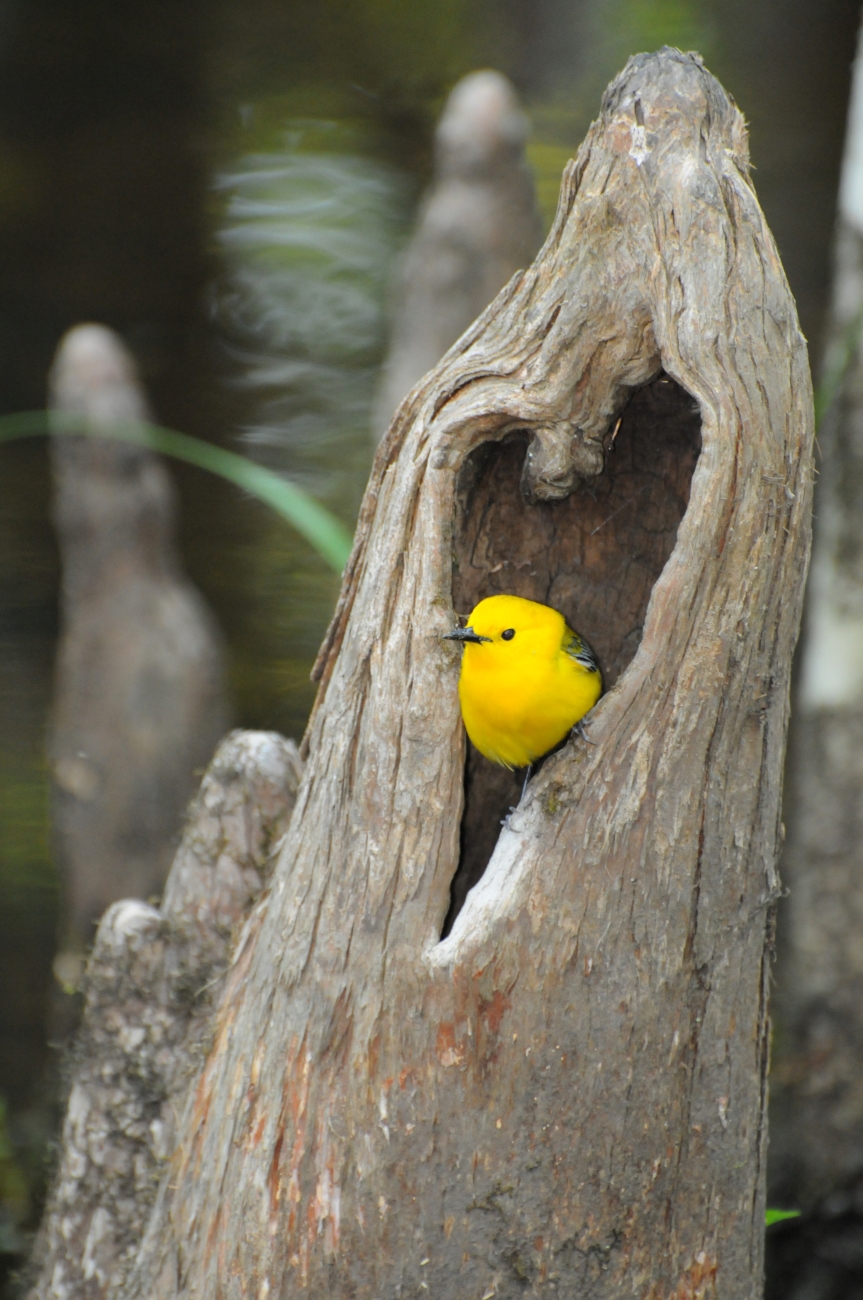 Prothonotary Warbler peeks through a heart shaped hole