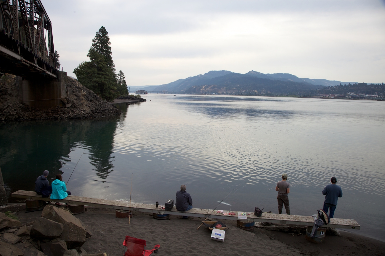 Anglers fish for Fall Chinook salmon on the Columbia River by a background of two bridges. Pacific Northwest Fisheries.