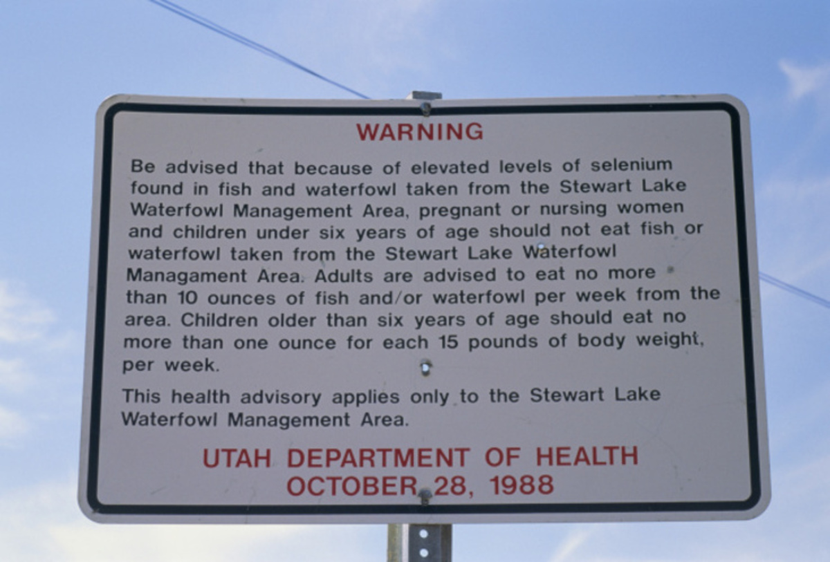 Public health warning sign for elevated levels of selenium in fish and waterfowl taken from the Stewart Lake Waterfowl Management Area in Stewart, Utah, posted by the Utah Department of Health.
