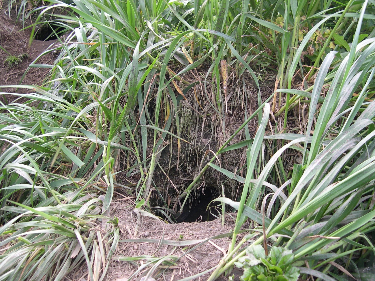 Burrow of a nesting tufted puffin on Bogoslof Island. By excavating these burrows, the puffins gain protection from predators for their vulnerable eggs and chicks.