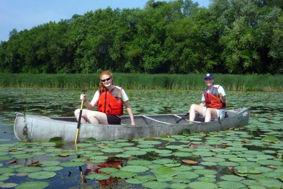 Interns in canoes pull invasive species at the Eastern Massachusetts National Wildlife Refuge Complex.