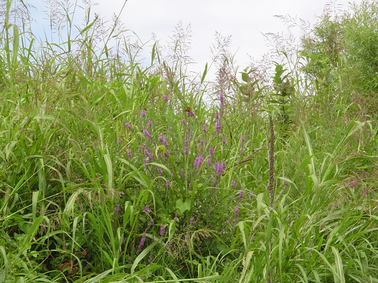 Two invasive plants growing together: purple loosestrife surrounded by johnson grass.