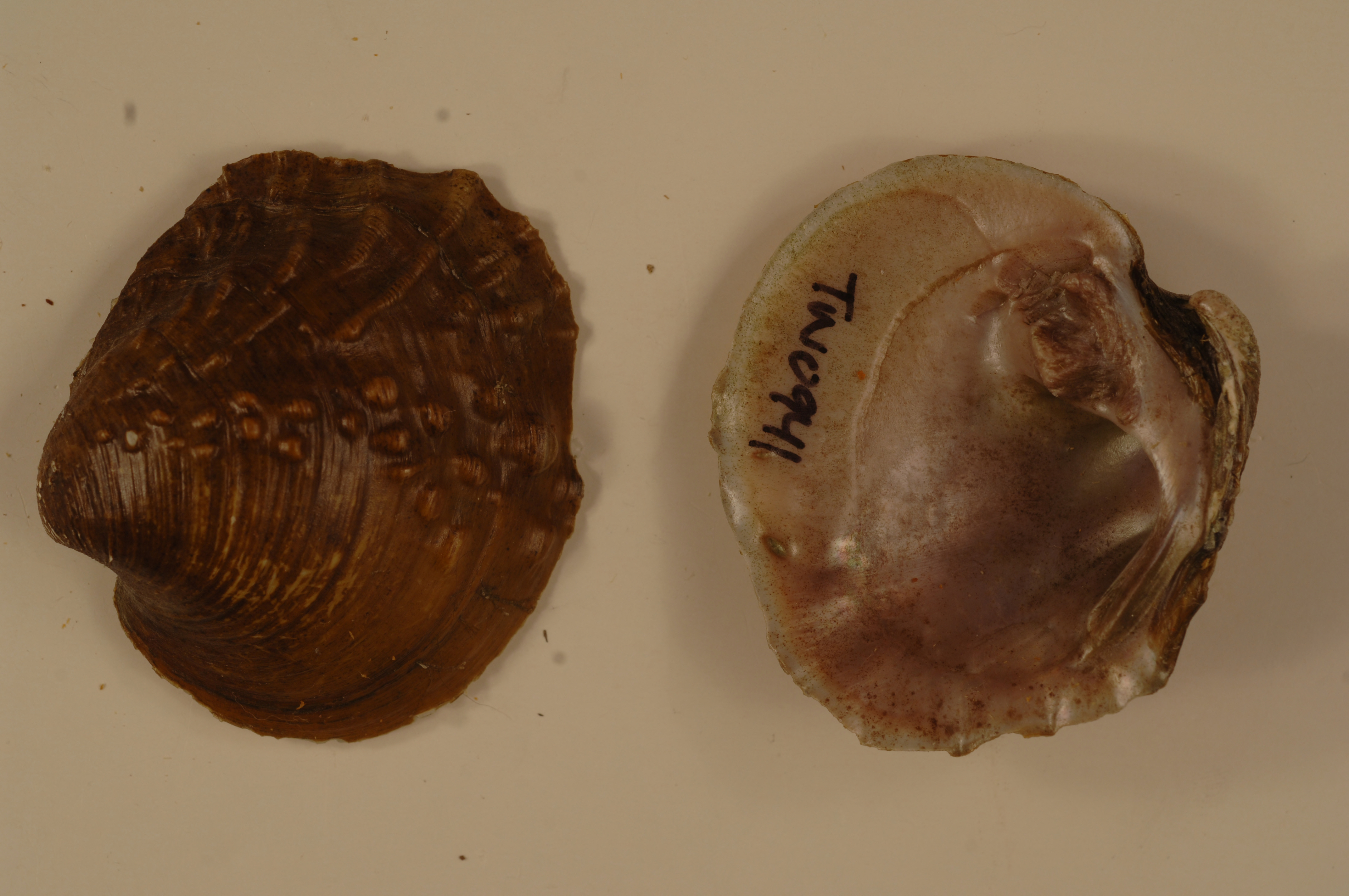 NCTC Freshwater Mussels Teaching Collection: Order: Unionoida Family: Unionidae Genus (ITIS): Cyclonaias Species: tuberculata Williams et al.: Use to be: Location Name: Duck River, Milltown Location State: TN