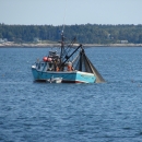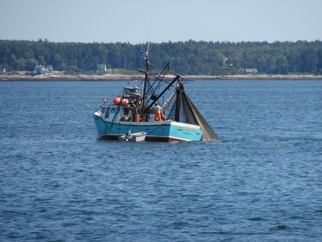 Fishing boat pulling in purse seine net with menhaden, Casco Bay, Maine.