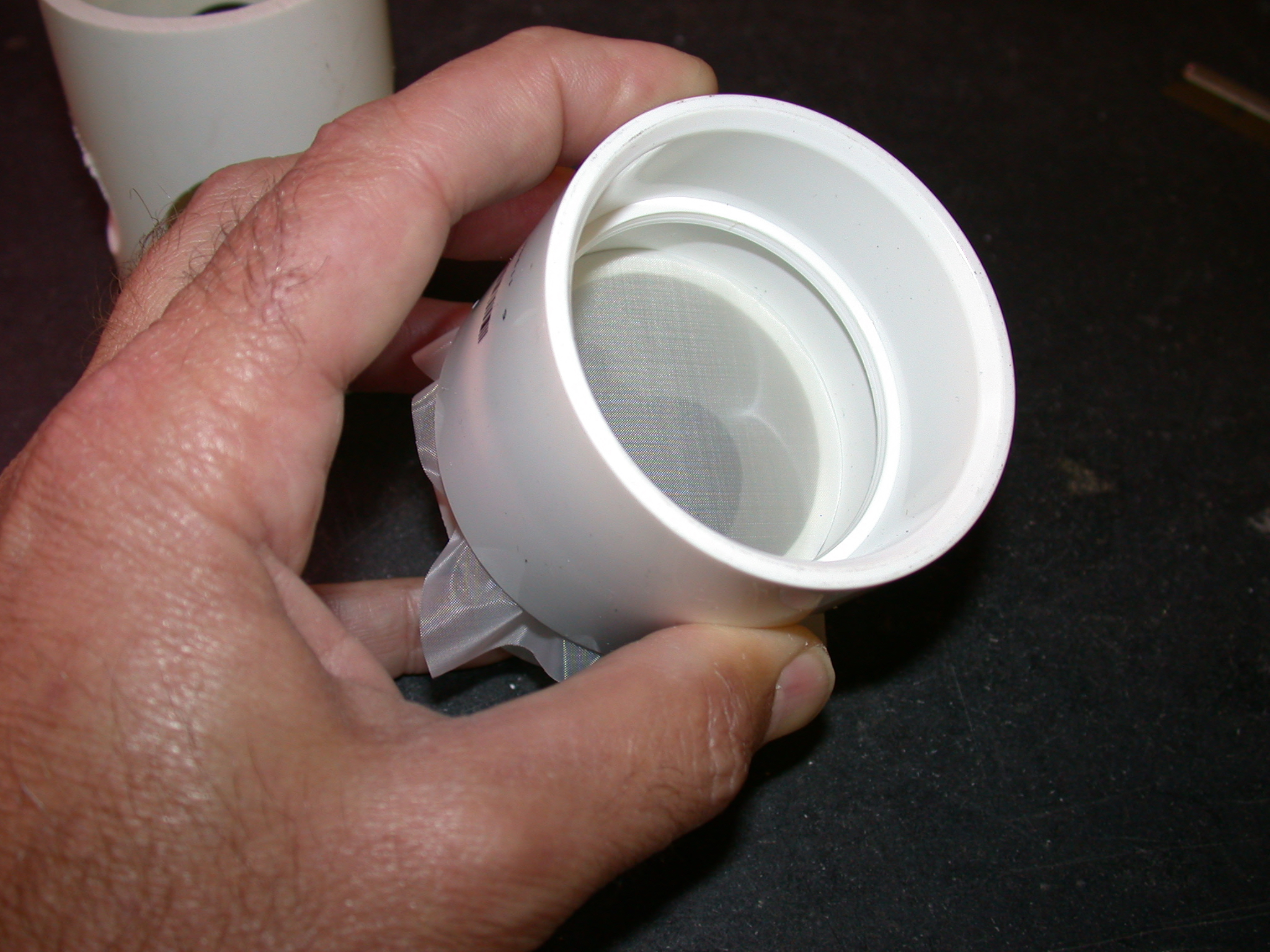 The PVC pipe and PVC coupler are pressed together with the piece of fine mesh screen in between, forming a filter cup. Photo: Chris Barnhart, Missouri State University.
