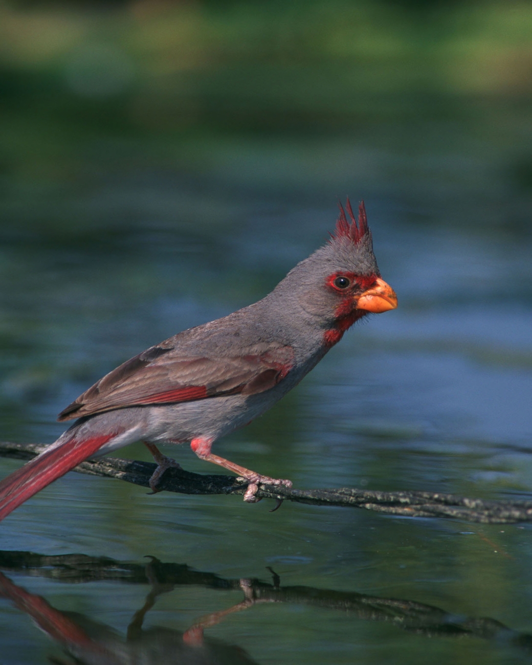 A pyrrhuloxia, also known as the desert cardinal, perches on a branch above water.