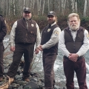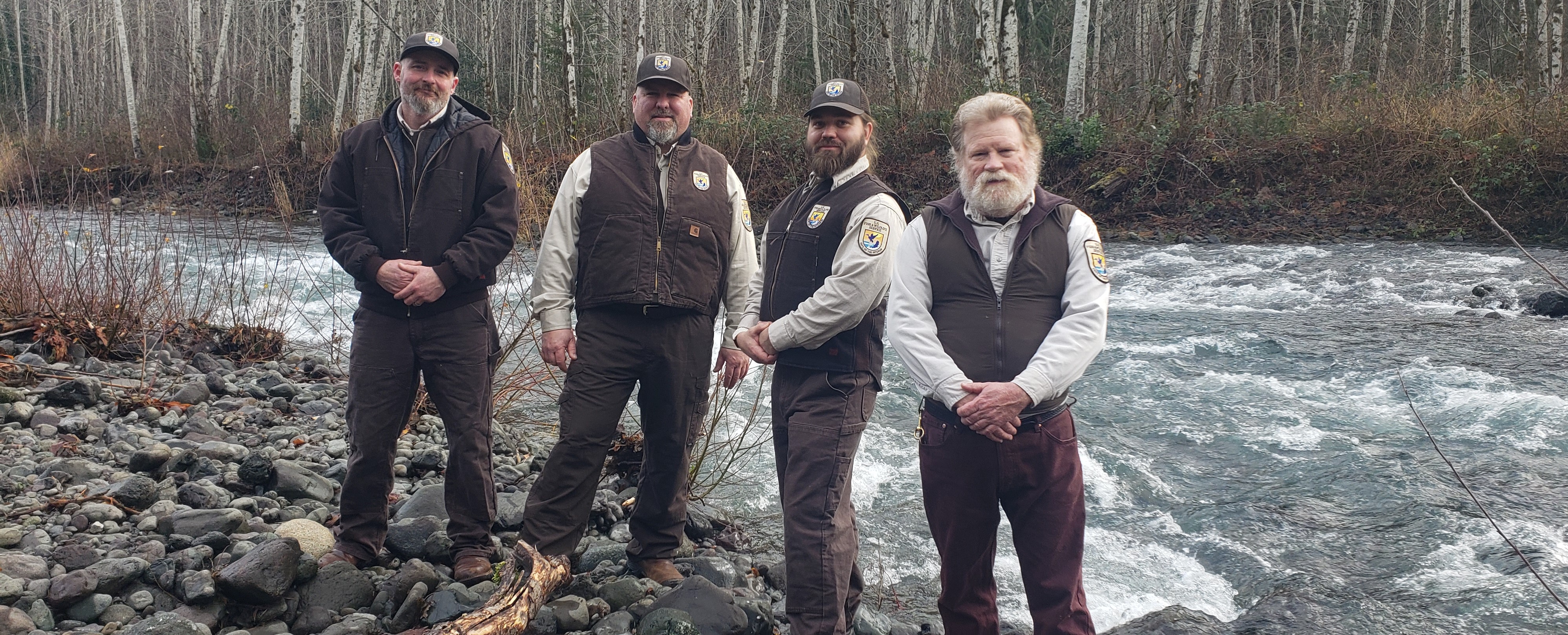 Quilcene National Fish Hatchery staff poses for a group photo beside the Big Quilcene River.