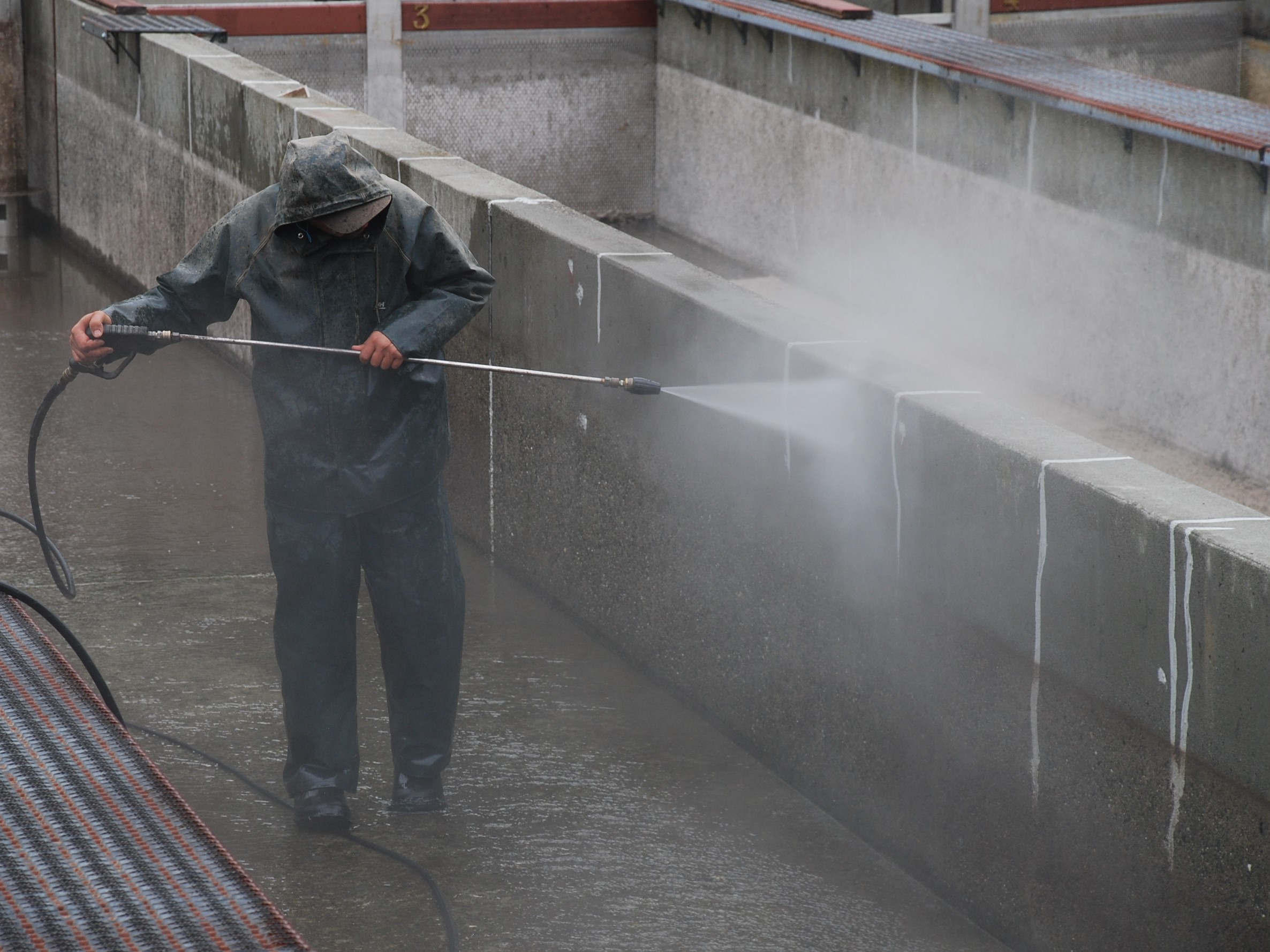 Quilcene National Fish Hatchery staff power washing the concrete raceways (fish tanks).