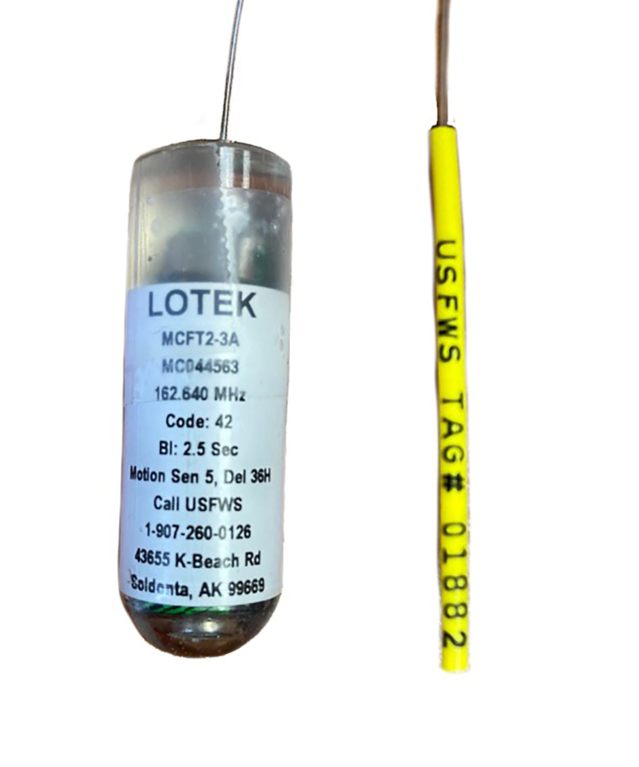 A radio tag (left) used in a Coho Salmon telemetry study and a secondary mark (floy tag).