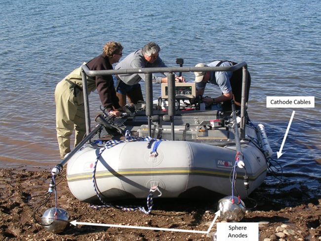 Raft electrofisher with two boom sphere anodes and cathode cables off both sides of the raft