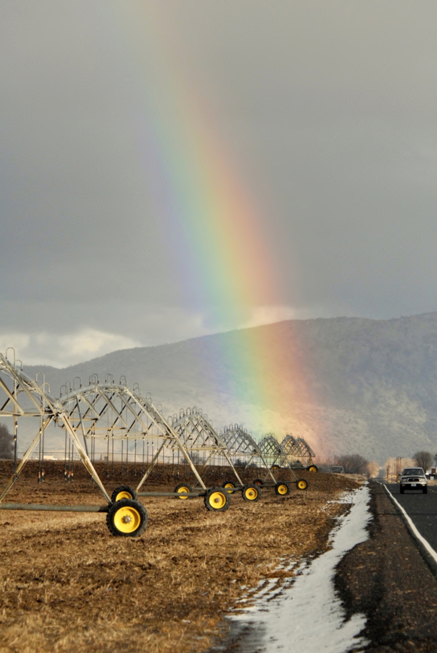 A rainbow arches over the irrigation wheel line at the Klamath Basin National Wildlife Refuge Complex. Image taken from USFWS Pacific Southwest Region Flickr page.
