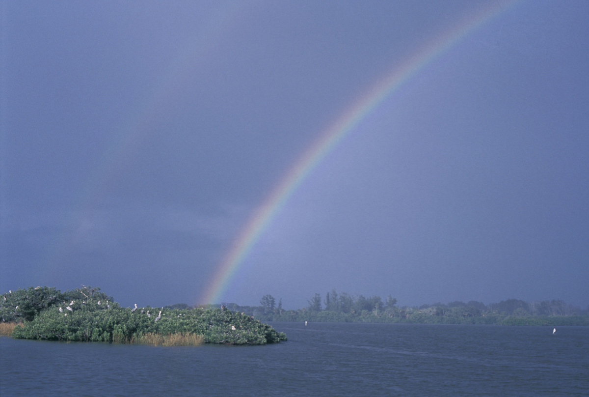 A rainbow shines over Pelican Island National Wildlife Refuge.