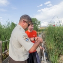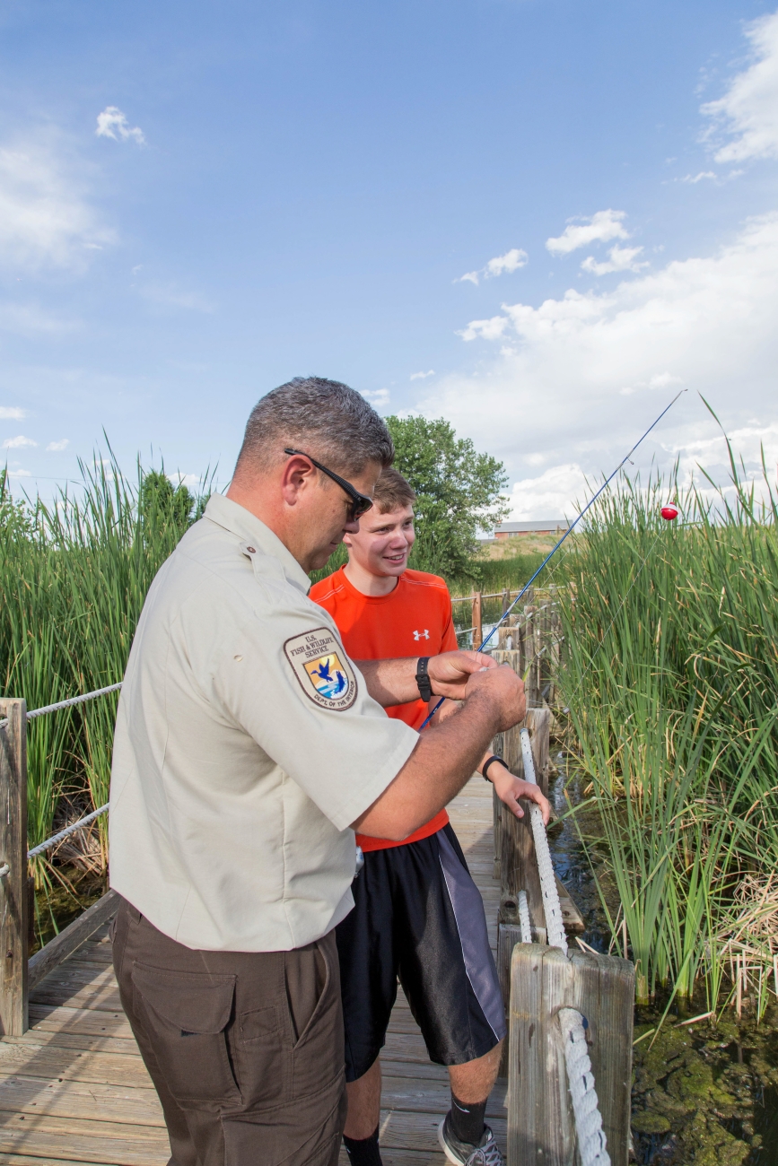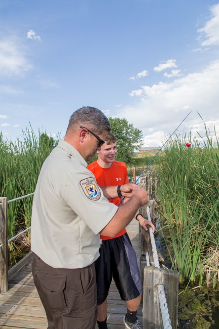 Young boy with Park Ranger fishing from a dock at Rocky Mountain Arsenal NWR.