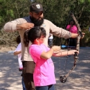 Ranger Garza coaches a girl on proper form while drawing back a bow.