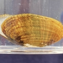 A rayed bean mussel shell stored in liquid for display, showing the characteristic broken green rays on the shell.