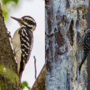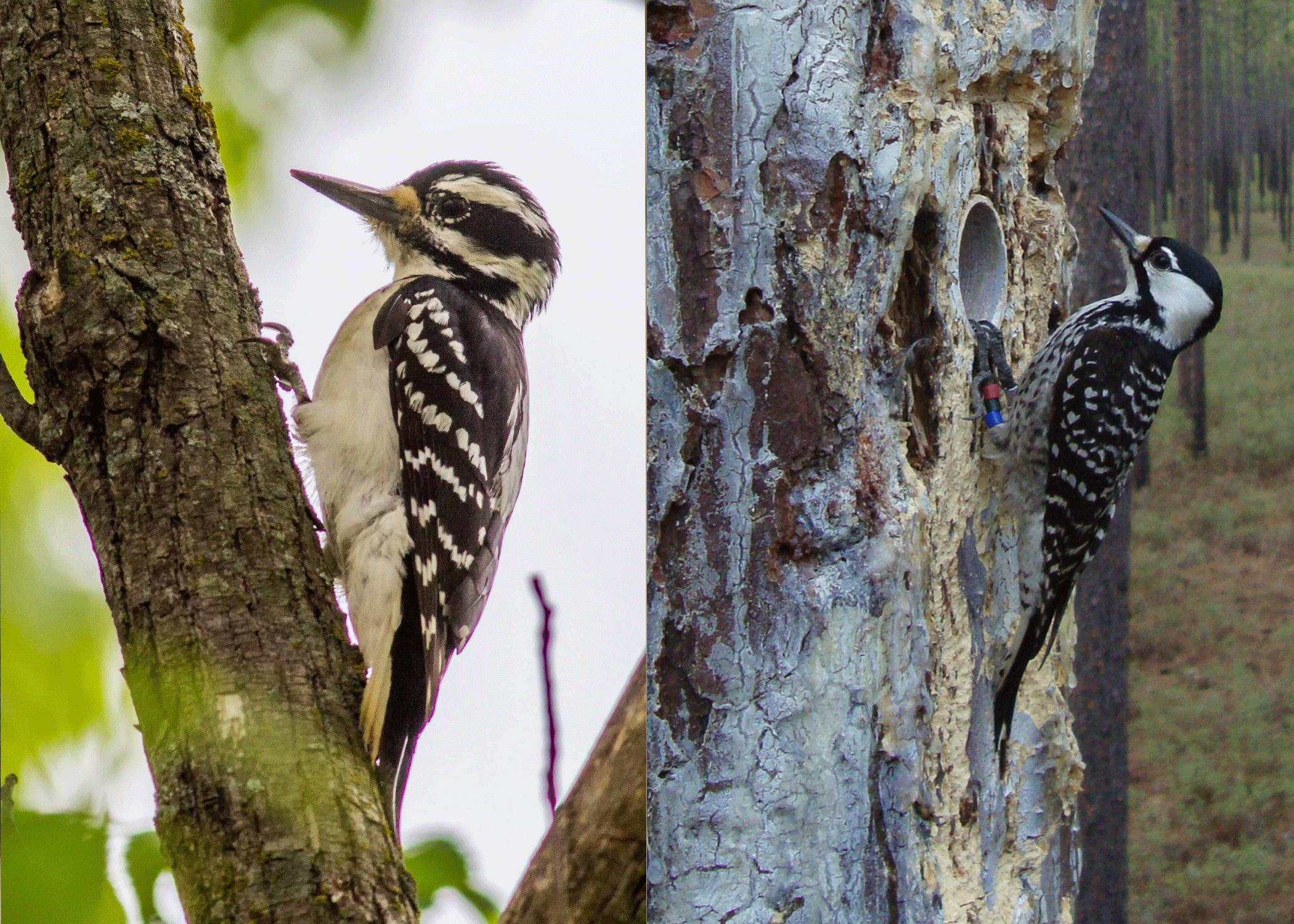 A hairy woodpecker on the left and a red-cockaded woodpecker on the right.